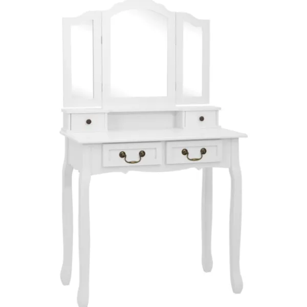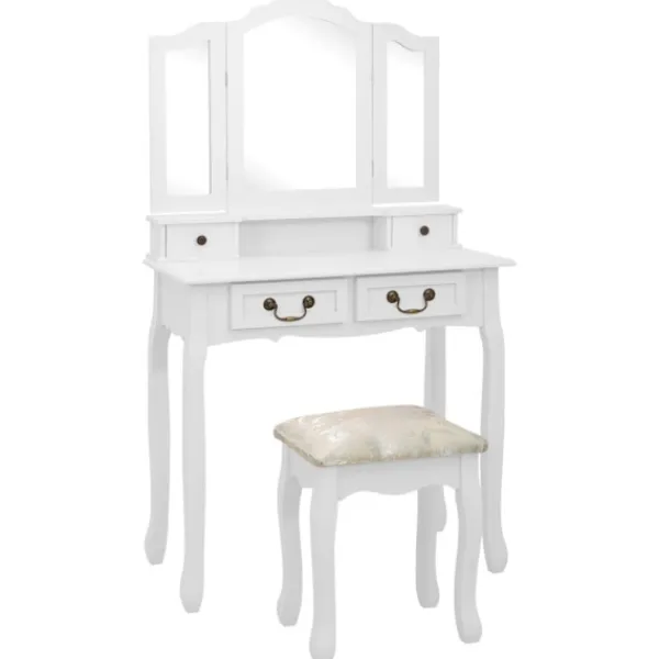 Detta sminkbord tillverkat i paulowniaträ är en fin möbel tack vare dess lyxiga stil. Dess fyra olika lådor och öppna fack erbjuder gott om plats för förvaring av smink och smycken. Bordsskivan är också en utmärkt plattform för att ställa parfymer eller liknande. Den medföljande pallen har en vadderad sits och en matchande bas i trä. Dessutom har den inbyggda speglar.