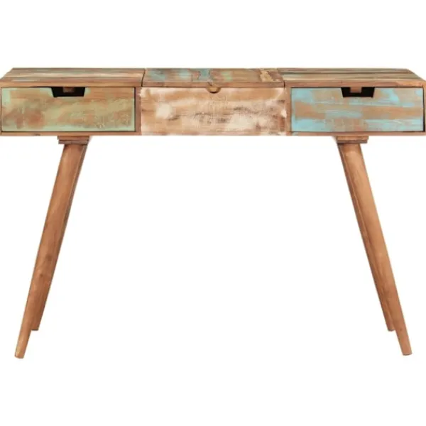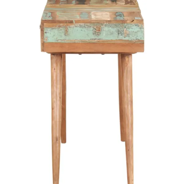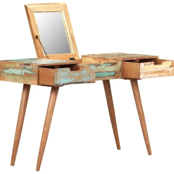 Detta sminkbord är tillverkat i återvunnet trä som har samlats in från reglar, golv och balkar från gamla byggnader som rivits och kan bestå av olika typer av trä såsom furu, teak, björk, ek, ceder, mangoträ, akacia, osv. Detta innebär att det återvunna träet behåller egenskaperna från dessa olika träslag. Återvunnet trä är redan åldrat, vittrat och torkat, så det varken krymper eller böjs. Sminkbordet är helt handgjort och de vackra träådringarna gör varje möbel unik och något olik de andra. Sminkbordet har en spegel och ett dold utrymme. Det har också 2 lådor som ger dig tillräckligt med plats för alla dina sminkprodukter.