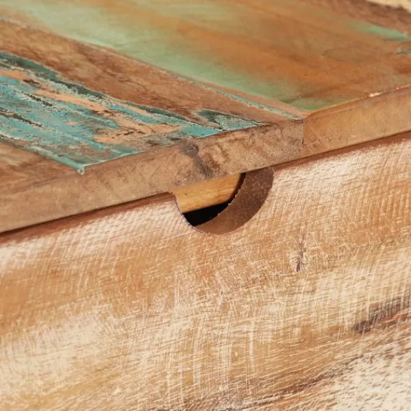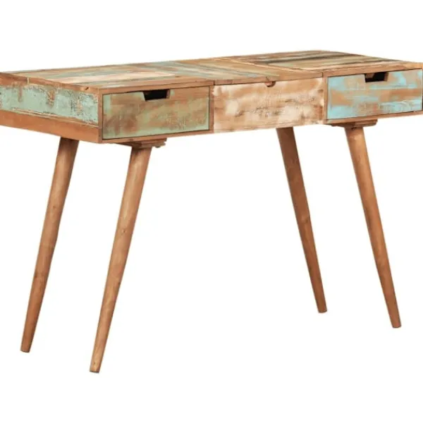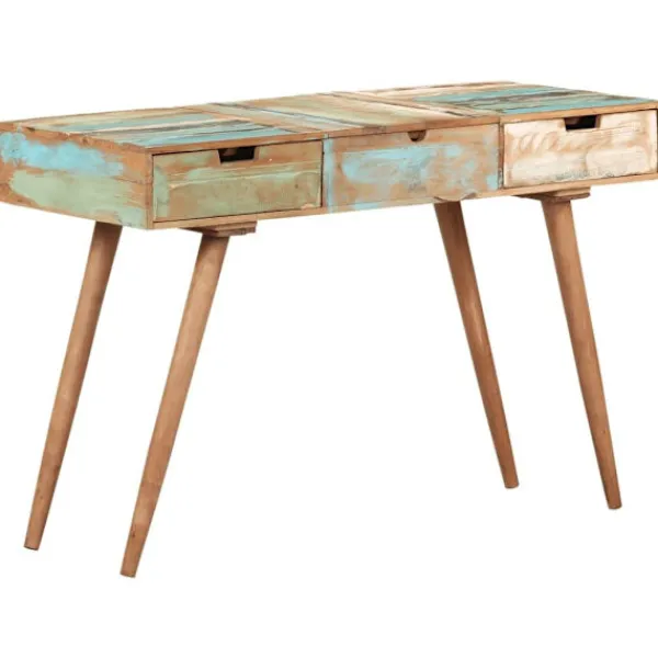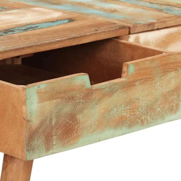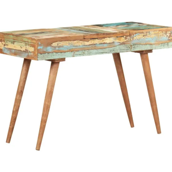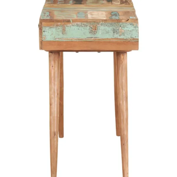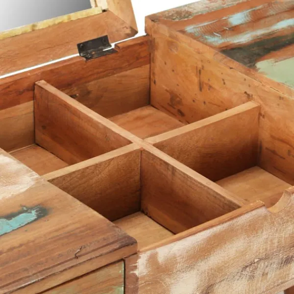 Sminkbordet i trä utmärks av en modern och snygg design och blir utan tvekan ett blickfång i ditt sovrum. Detta sminkbord är tillverkat i återvunnet trä som har samlats in från reglar, golv och balkar från gamla byggnader som rivits och kan bestå av olika typer av trä såsom furu, teak, björk, ek, ceder, mangoträ, akacia, osv. Detta innebär att det återvunna träet behåller egenskaperna från dessa olika träslag. Återvunnet trä är redan åldrat, vittrat och torkat, så det varken krymper eller böjs. Sminkbordet är helt handgjort och de vackra träådringarna gör varje möbel unik och något olik de andra. Sminkbordet har en spegel och ett dold utrymme. Det har också 2 lådor som ger dig tillräckligt med plats för alla dina sminkprodukter. Viktigt: Färger varierar från möbel till möbel, vilket gör varje möbel unik. Leveransen är slumpartad, vilket säkerställer varje produkts exklusivitet och individualitet. VARNING: För att förhindra att den välter måste denna produkt användas med det medföljande väggfästet.