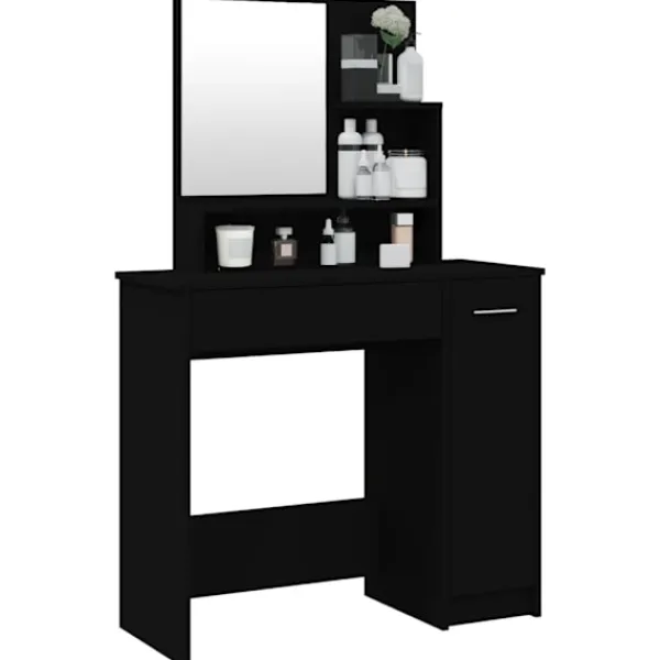 Sminkbordet med spegel är ett bra komplement till din sovrumsinredning samtidigt som det håller din kosmetika nära till hands! Praktiskt material: Det konstruerade träet är av exceptionell kvalitet med slät yta och har också styrka, stabilitet samt motståndskraft mot fukt. Det är tillverkat av konstruerat trä och är enkelt att rengöra.Gott om förvaring: Lådan och de öppna hyllorna på sminkbordet erbjuder plats för sminkartiklar och allt har sin plats.Spegel: Spegeln är en bra hjälp när du sminkar dig och utstrålar en elegant känsla på bordet.Praktisk dörr: Håll ordning i ditt hem genom att gömma småsaker bakom bordets dörrar. Varning:För att förhindra att den välter måste denna produkt användas med den medföljande väggfästenheten.