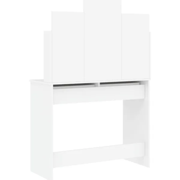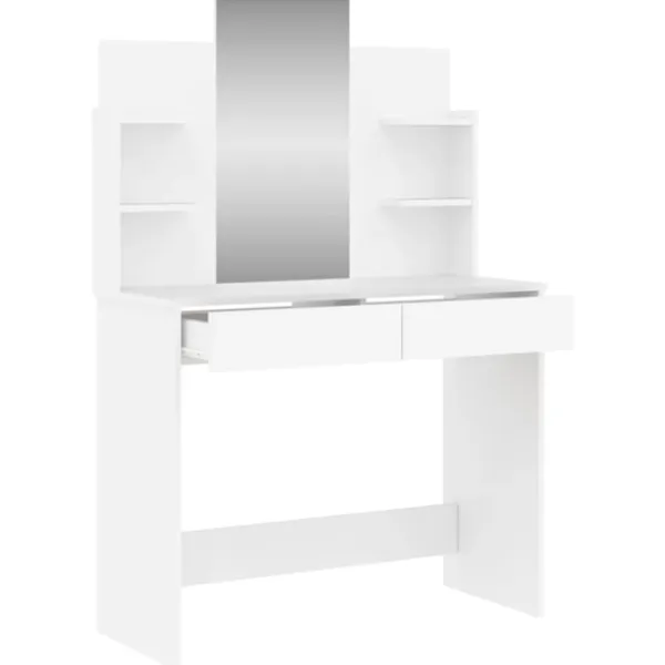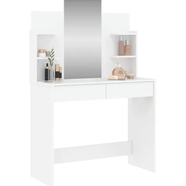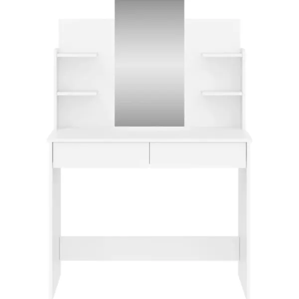 Sminkbordet med spegel har en tidlös och elegant design och passar perfekt i din sovrumsinredning samtidigt som du har dina skönhetsprodukter nära till hands! Hållbart material: Det konstruerade träet är av exceptionell kvalitet med slät yta och är också starkt, stabilt och fuktbeständigt. Sminkbordet är tillverkat av konstruerat trä och är enkelt att rengöra.Gott om förvaringsutrymme: Detta sminkbord har 2 lådor och 4 små hyllor, med gott om utrymme för att hålla dina skönhetsprylar välorganiserade.Spegel: Den medföljande vackra spegeln ger en tydlig bild när du sminkar dig och utstrålar en elegant känsla på bordet. Varning:För att förhindra att den välter måste denna produkt användas med den medföljande monteringsanordningen för vägg