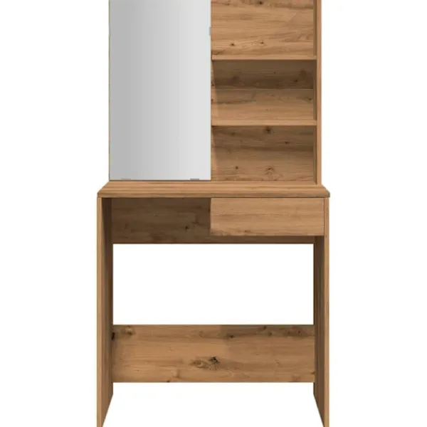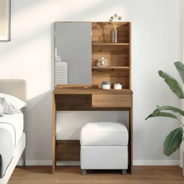 - Gott om förvaringsutrymme: Sminkbordsskivan, 3-våningshyllorna på bordet och en låda under bordet ger gott om plats för enkel åtkomst till smink, smycken och vardagliga saker.