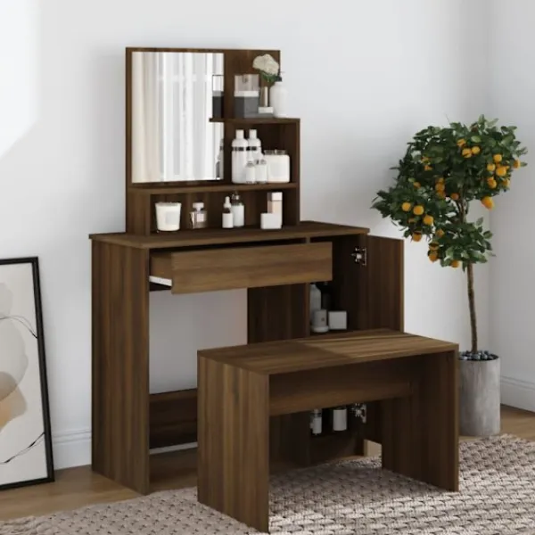 - Gott om förvaring: Lådan och de öppna hyllorna på sminkbordet erbjuder plats för sminkartiklar och allt har sin plats.