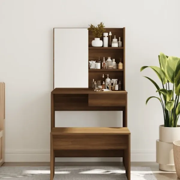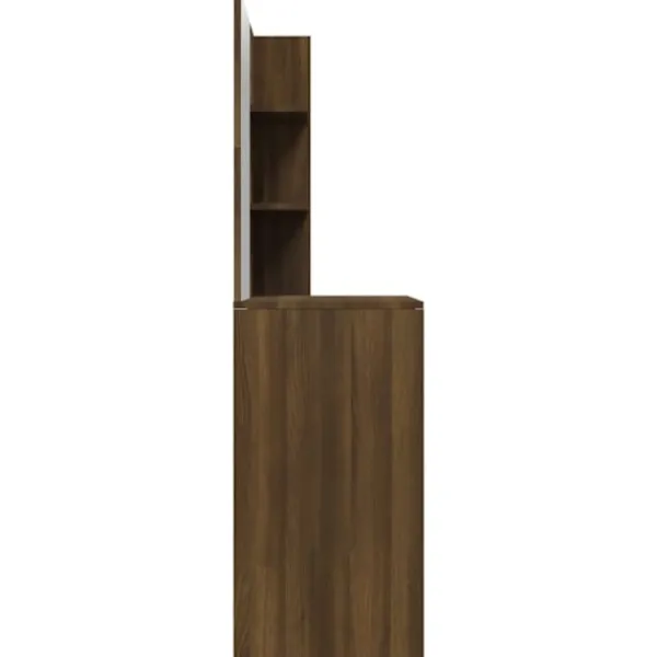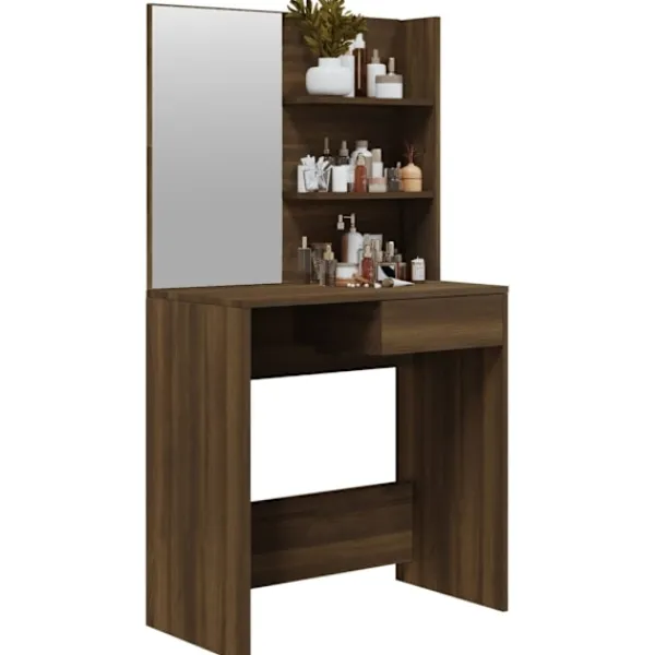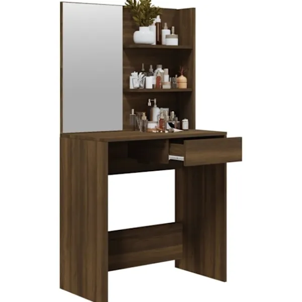 Detta sminkbord blir ett riktigt blickfång i din inredning, tack vare dess raka linjer och asymmetriska form. Stabilt material: Det konstruerade träet är av exceptionell kvalitet med slät yta och är också starkt, stabilt och fuktbeständigt.Spegel: Sminkbordet med spegeln är perfekt för din dagliga skönhetsrutin. Spegeln låter dig ta hand om din hud och den underlättar när du sminkar dig!Gott om förvaringsutrymme: Bordsytan, de tvådelade hyllorna på bordet och lådan under bordet har gott om utrymme för enkel åtkomst till smink, smycken och vardagliga nödvändigheter.Dess moderna design har rena linjer och minimalistiskt utseende som en del av inredningsstilen. Varning:För att förhindra att den välter måste denna produkt användas med den medföljande monteringsanordningen för vägg Observera:Varje produkt levereras med en monteringsmanual i lådan för enkel montering.