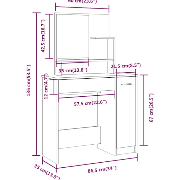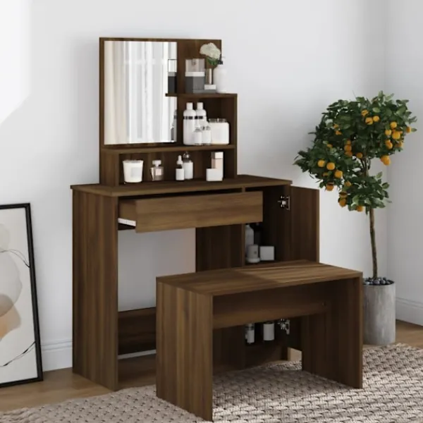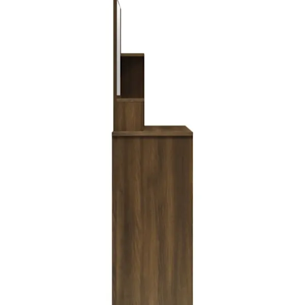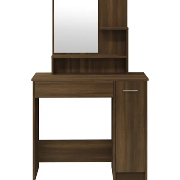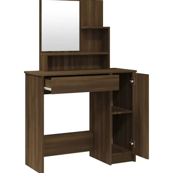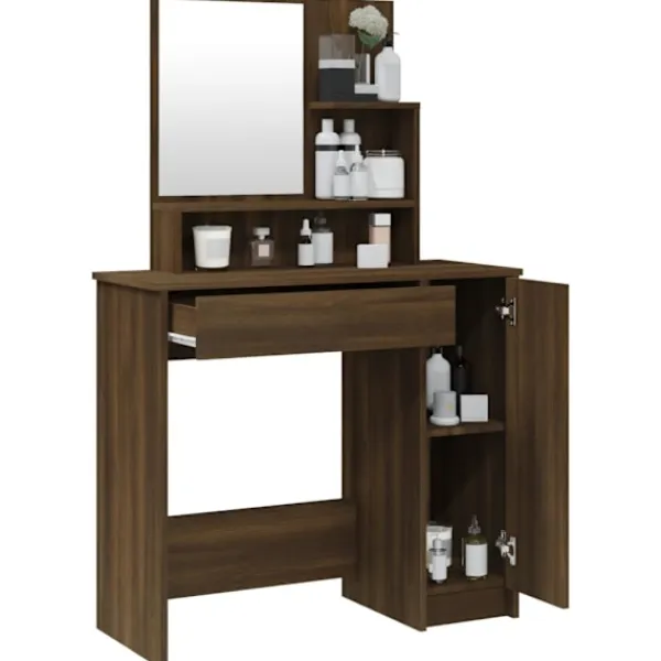 Detta sminkbord ger ditt sovrum ett tidlöst, elegant utseende. Sminkbordet med spegel är ett utmärkt komplement till din sovrumsinredning samtidigt som du har din kosmetika nära till hands! Praktiskt material: Det konstruerade träet är av exceptionell kvalitet med slät yta och har också styrka, stabilitet samt motståndskraft mot fukt. Det är tillverkat av konstruerat trä och är enkelt att rengöra.Gott om förvaring: Lådan och de öppna hyllorna på sminkbordet erbjuder plats för sminkartiklar och allt har sin plats.Spegel: Spegeln är en bra hjälp när du sminkar dig och utstrålar en elegant känsla på bordet.Praktisk dörr: Håll ordning i ditt hem genom att gömma småsaker bakom bordets dörrar. Varning:För att förhindra att den välter måste denna produkt användas med den medföljande monteringsanordningen för vägg Observera:Varje produkt levereras med en monteringsmanual i lådan för enkel montering.