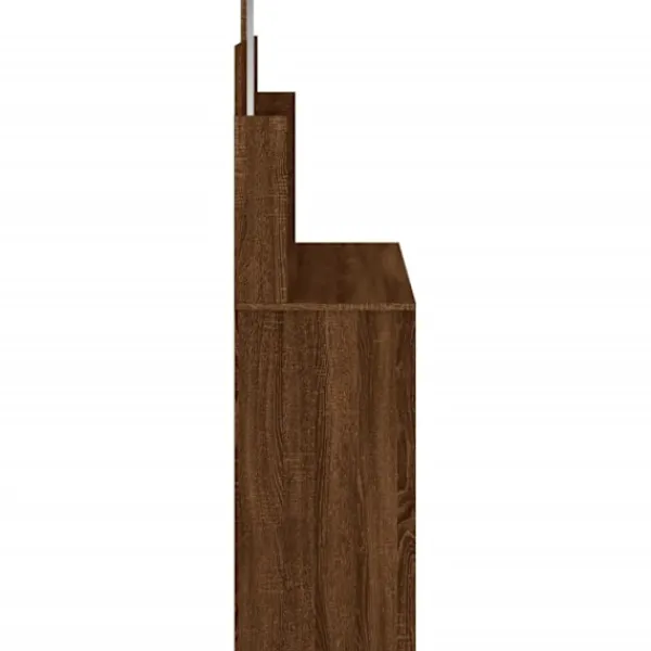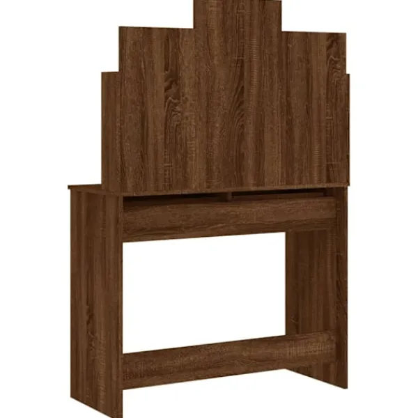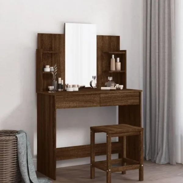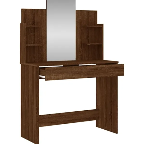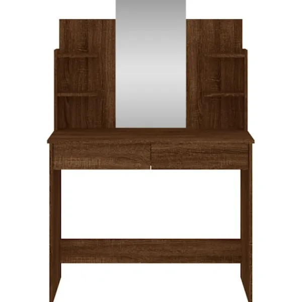 Sminkbordet med spegel har en tidlös och elegant design och passar perfekt i din sovrumsinredning samtidigt som du har dina skönhetsprodukter nära till hands! Hållbart material: Det konstruerade träet är av exceptionell kvalitet med slät yta och är också starkt, stabilt och fuktbeständigt. Sminkbordet är tillverkat av konstruerat trä och är enkelt att rengöra.Gott om förvaringsutrymme: Detta sminkbord har 2 lådor och 4 små hyllor, med gott om utrymme för att hålla dina skönhetsprylar välorganiserade.Spegel: Den medföljande vackra spegeln ger en tydlig bild när du sminkar dig och utstrålar en elegant känsla på bordet. Varning:För att förhindra att den välter måste denna produkt användas med den medföljande monteringsanordningen för vägg