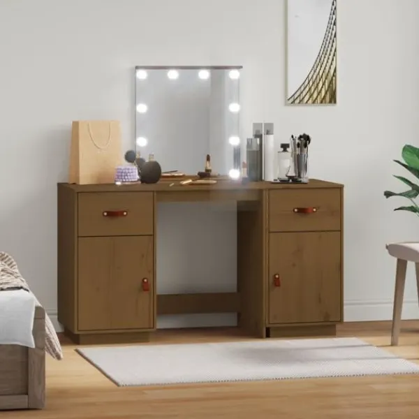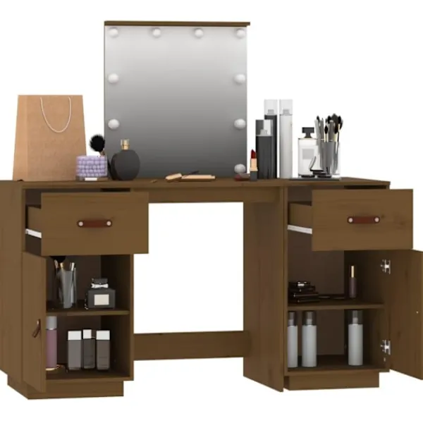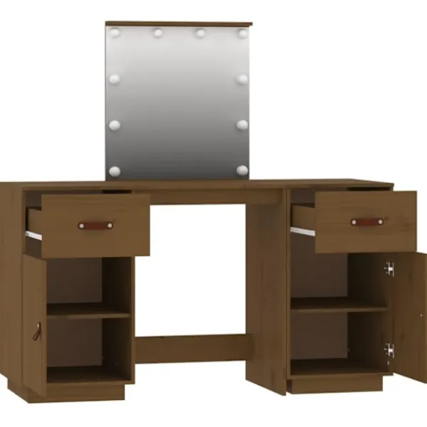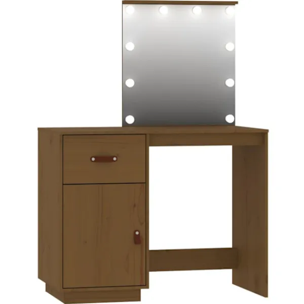 Detta trendiga sminkbord i trä med spegel är ett utmärkt komplement till din sovrumsinredning. Så du kan hålla din kosmetika inom räckhåll! Massivt furuträ: Massivt furuträ är ett vackert naturmaterial. Furuträ har raka fibrer, och knutarna ger materialet sin rustika utstrålning.Gott om förvaring: Sminkbordet har gott om utrymme för enkel åtkomst till smink, smycken och vardagliga nödvändigheter.Spegel: Den medföljande vackra spegeln ger en tydlig bild när du sminkar dig och utstrålar en elegant känsla på bordet.LED-ljus: Spegeln har också LED-lampor med USB, som är enkla att byta läge från varmt till kallvitt. LED-lamporna runt spegeln avger ljus.Praktisk dörr: Håll dina väsentligheter fria från damm genom att gömma dem i detta skåp. Varning:För att förhindra att den välter måste denna produkt användas med den medföljande monteringsanordningen för vägg Observera:Varje produkt levereras med en monteringsmanual i lådan för enkel montering.