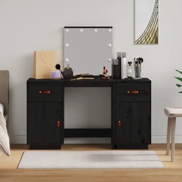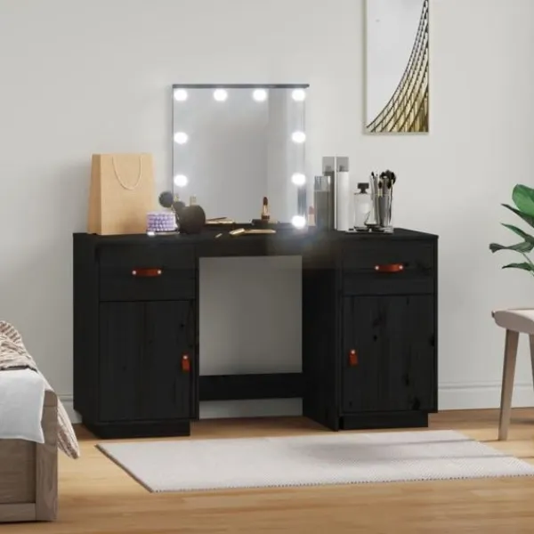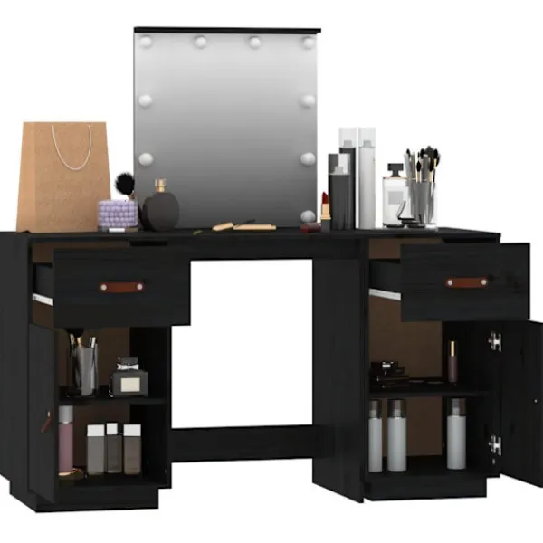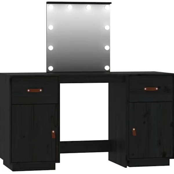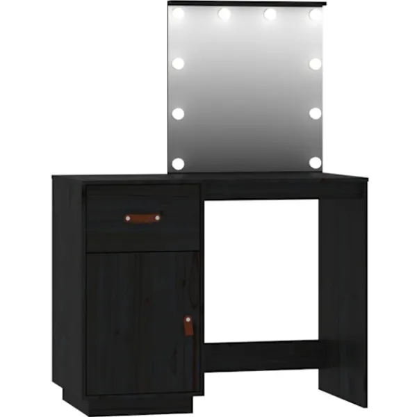 Detta trendiga sminkbord i trä med spegel är ett utmärkt komplement till din sovrumsinredning. Så du kan hålla din kosmetika inom räckhåll! Massivt furuträ: Massivt furuträ är ett vackert naturmaterial. Furuträ har raka fibrer, och knutarna ger materialet sin rustika utstrålning.Gott om förvaring: Sminkbordet har gott om utrymme för enkel åtkomst till smink, smycken och vardagliga nödvändigheter.Spegel: Den medföljande vackra spegeln ger en tydlig bild när du sminkar dig och utstrålar en elegant känsla på bordet.LED-ljus: Spegeln har också LED-lampor med USB, som är enkla att byta läge från varmt till kallvitt. LED-lamporna runt spegeln avger ljus.Praktisk dörr: Håll dina väsentligheter fria från damm genom att gömma dem i detta skåp. Varning:För att förhindra att den välter måste denna produkt användas med den medföljande monteringsanordningen för vägg Observera:Varje produkt levereras med en monteringsmanual i lådan för enkel montering.