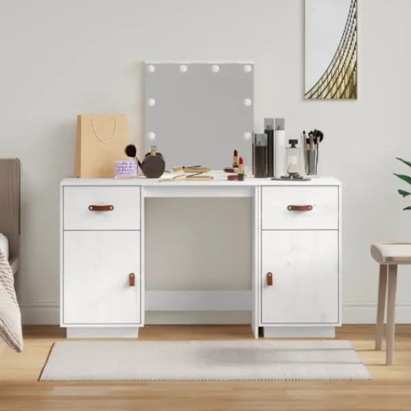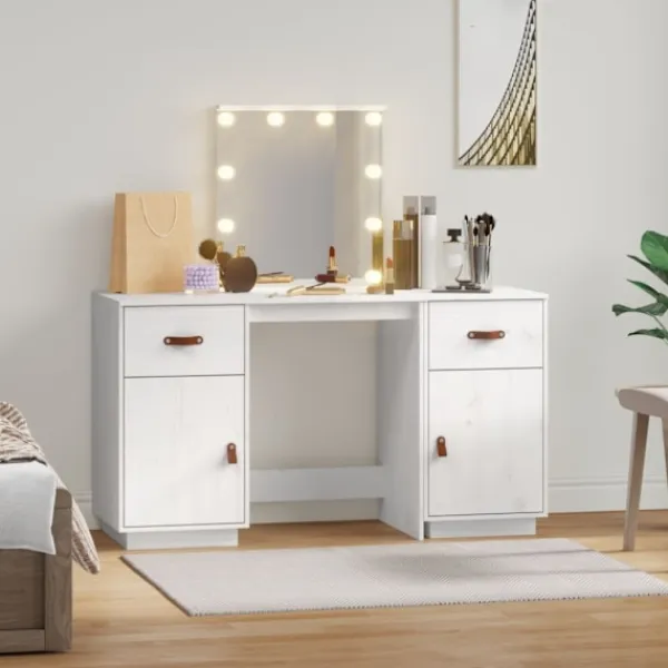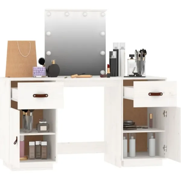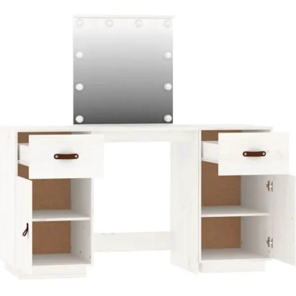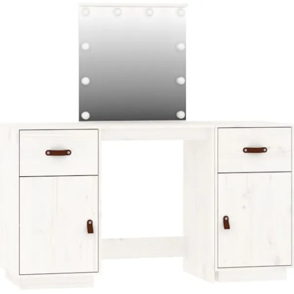 Detta trendiga sminkbord i trä med spegel är ett utmärkt komplement till din sovrumsinredning. Så du kan hålla din kosmetika inom räckhåll! Massivt furuträ: Massivt furuträ är ett vackert naturmaterial. Furuträ har raka fibrer, och knutarna ger materialet sin rustika utstrålning.Gott om förvaring: Sminkbordet har gott om utrymme för enkel åtkomst till smink, smycken och vardagliga nödvändigheter.Spegel: Den medföljande vackra spegeln ger en tydlig bild när du sminkar dig och utstrålar en elegant känsla på bordet.LED-ljus: Spegeln har också LED-lampor med USB, som är enkla att byta läge från varmt till kallvitt. LED-lamporna runt spegeln avger ljus.Praktisk dörr: Håll dina väsentligheter fria från damm genom att gömma dem i detta skåp. Varning:För att förhindra att den välter måste denna produkt användas med den medföljande monteringsanordningen för vägg Observera:Varje produkt levereras med en monteringsmanual i lådan för enkel montering.