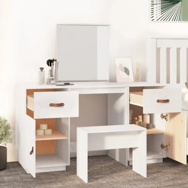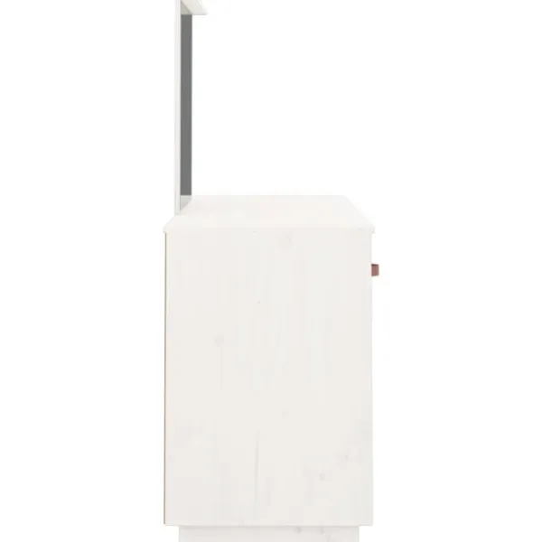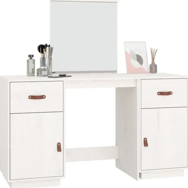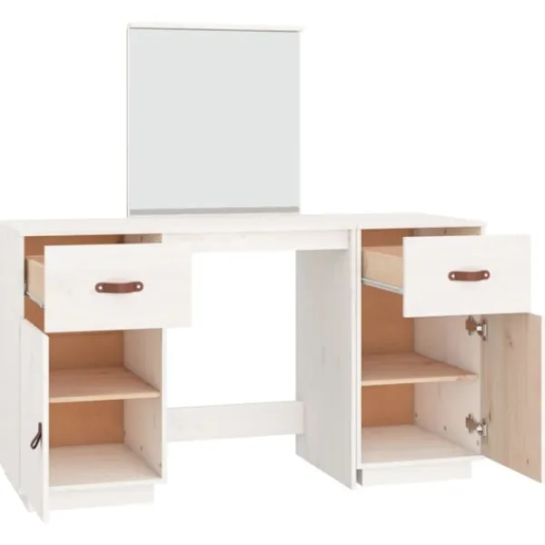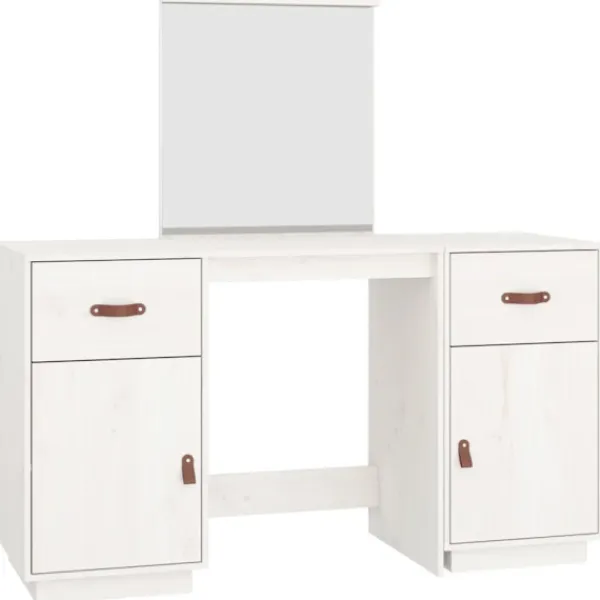 Detta klassiska sminkbord i trä med spegel är ett utmärkt komplement till din sovrumsinredning. Så du kan hålla din kosmetika inom räckhåll! Massivt furuträ: Massivt furuträ är ett vackert naturmaterial. Furuträ har raka fibrer, och knutarna ger materialet sin rustika utstrålning.Gott om förvaring: Sminkbordet har gott om utrymme för enkel åtkomst till smink, smycken och vardagliga nödvändigheter.Spegel: Den medföljande vackra spegeln ger en tydlig bild när du sminkar dig och utstrålar en elegant känsla på bordet.Praktisk dörr: Håll dina väsentligheter fria från damm genom att gömma dem i detta skåp.Breda applikationer: Detta sminkbord är lämpligt för rum, till exempel ditt sovrum, garderob med mera. Varning:För att förhindra att den välter måste denna produkt användas med den medföljande monteringsanordningen för vägg Observera:Varje produkt levereras med en monteringsmanual i lådan för enkel montering.