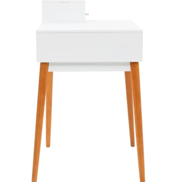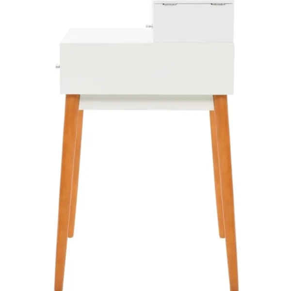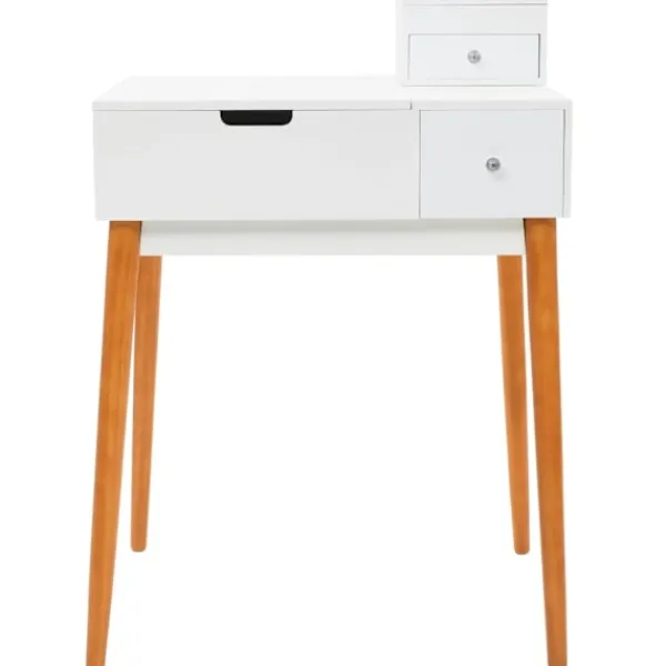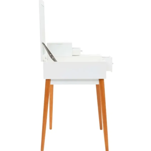 Detta sminkbord blir ett perfekt tillägg i ditt sovrum eller omklädningsrum tack vare sin eleganta design och sin stilrena vita finish. Det här bordet är tillverkat i MDF och har en spegel. Det har en vänsterpanel som kan lyftas för att avslöja en spegel och rymliga förvaringsutrymmen för smycken. Det erbjuder gott om plats för dina smink-, hår- och hudvårdsprodukter. När spegeln inte används blir bordsskivan en perfekt plats att ställa stora mängder smink, smycken och skönhetsprodukter. De robusta träbenen bidrar också till bordets stabilitet och moderna stil inspirerad av 50-talet. Monteringen är enkel.