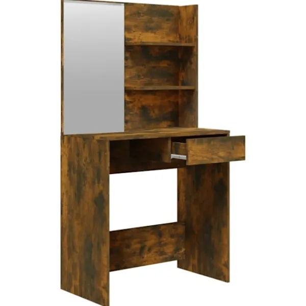 Detta sminkbord blir ett riktigt blickfång i din inredning, tack vare dess raka linjer och asymmetriska form. Stabilt material: Det konstruerade träet är av exceptionell kvalitet med slät yta och är också starkt, stabilt och fuktbeständigt.Spegel: Sminkbordet med spegeln är perfekt för din dagliga skönhetsrutin. Spegeln låter dig ta hand om din hud och den underlättar när du sminkar dig!Gott om förvaringsutrymme: Bordsytan, de tvådelade hyllorna på bordet och lådan under bordet har gott om utrymme för enkel åtkomst till smink, smycken och vardagliga nödvändigheter.Dess moderna design har rena linjer och minimalistiskt utseende som en del av inredningsstilen. Varning:För att förhindra att den välter måste denna produkt användas med den medföljande monteringsanordningen för vägg Observera:Varje produkt levereras med en monteringsmanual i lådan för enkel montering.
