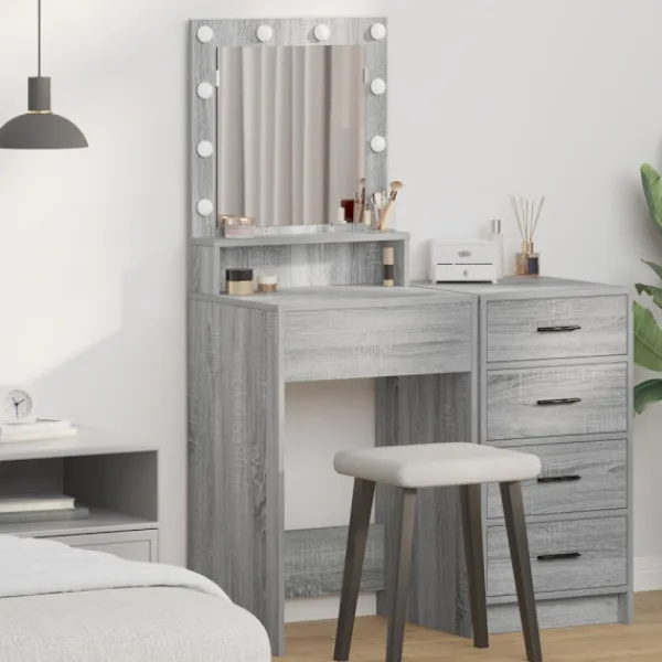 - Material: Sminkbordet är gjort av konstruerat trä, vilket ger en stark och hållbar konstruktion. Träet är valt för sin hållbarhet och stil, vilket gör att det ser bra ut länge. Det säkerställer att möbeln står emot slitage och skador, vilket ger lång livslängd.