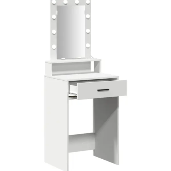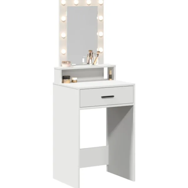 - Integrerade spegelbelysningar Utrustat med energieffektiva LED-lampor runt spegeln, lyser detta sminkbord bra och ger perfekta ljusförhållanden för sminkning. De LED-lamporna ger ett klart och tydligt ljus för alla uppgifter.