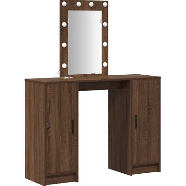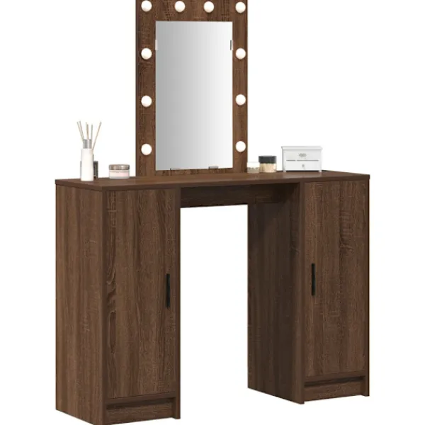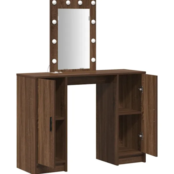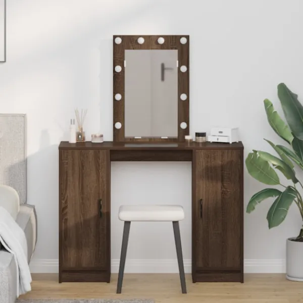 Det moderna sminkbordet kombinerar stil och funktion helt perfekt med sin smidiga design. Gjort av konstruerat trä ger den matta ytan en sofistikerad känsla, så det blir en central möbel i moderna sovrum. Bordet är inte bara en plats för smink utan lyfter även stämningen med sin stiliga design och smarta förvaringslösningar. De mjukt integrerade LED-lamporna, som drivs av USB, ger ett varmt ljus som gör att du ser bra ut när du fixar dig.