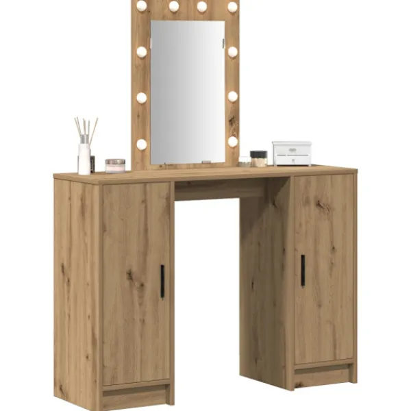 Det moderna sminkbordet kombinerar stil och funktion helt perfekt med sin smidiga design. Gjort av konstruerat trä ger den matta ytan en sofistikerad känsla, så det blir en central möbel i moderna sovrum. Bordet är inte bara en plats för smink utan lyfter även stämningen med sin stiliga design och smarta förvaringslösningar. De mjukt integrerade LED-lamporna, som drivs av USB, ger ett varmt ljus som gör att du ser bra ut när du fixar dig.