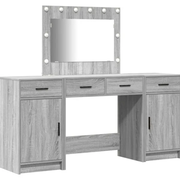 Det här moderna sminkbordet är en perfekt mix av funktion och stil. Med sin rektangulära form och smarta förvaringsfack passar det bra i vilket sovrum som helst. Tillverkat av konstruerat trä har bordet en snygg matt finish som ger det ett modernt utseende. Med en spegel som har LED-lampor är det skapat för att tillfredsställa dina skötselbehov samtidigt som det ser bra ut i ditt rum.
