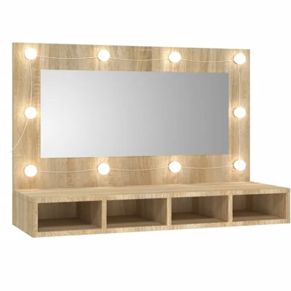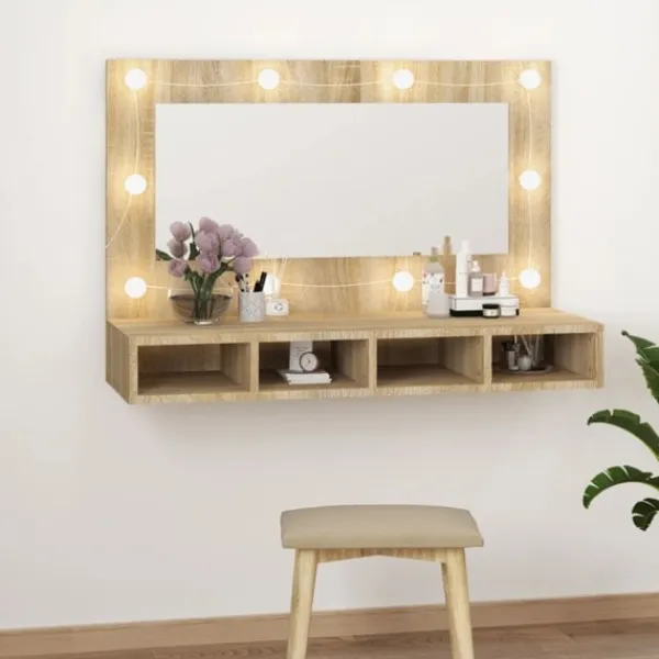 Håll ditt smink organiserat i detta trendiga spegelskåp med LED-lampor! Hållbart material: Det konstruerade träet är av exceptionell kvalitet med slät yta och är också starkt, stabilt och fuktbeständigt.LED-ljus: Spegeln har också LED-lampor med USB, som är enkla att byta läge från varmt till kallvitt. LED-lamporna runt spegeln avger ljus.Flexibla installationssätt: Spegeln med LED kan placeras direkt på din byrå, alternativt fästas på väggen för att spara golvutrymme.Gott om förvaringsutrymme: Detta väggskåp har 4 öppna hyllor, som är pålitliga förvaringsplatser. Observera:Varje produkt levereras med en monteringsmanual i lådan för enkel montering.Skruv(ar) och plugg(ar) för insidan av väggen ingår ej. Sök och använd skruv(ar) och plugg(ar) som passar dina väggar. Om du är osäker, sök professionell rådgivning. Läs och följ varje steg i instruktionerna noggrant.