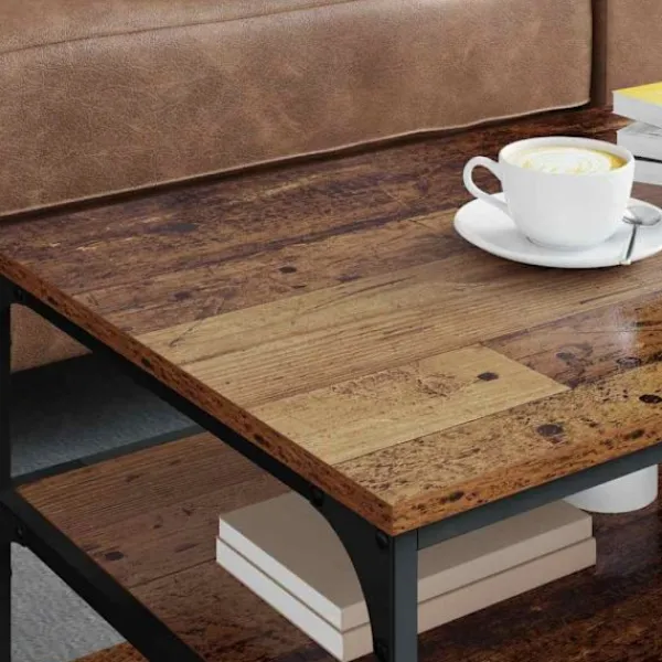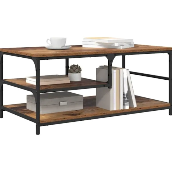 Det här kaffebordet av trä är en smakfull blandning av rustik och industriell stil som passar snyggt i de flesta vardagsrum. Med sin rektangulära form och släta yta i konstruerat trä utgör den verkligen en blickfångare. Den svarta metallramen ger en stark kontrast och bidrar till bordets stiliga och hållbara design, perfekt för att hålla drycker, böcker och prydnadsföremål.