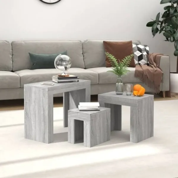 Dessa klassiska stapelbara soffbord kombinerar modern design med ett praktiskt, innovativt utseende, vilket gör dem till ett värdefullt och elegant tillskott till ditt vardagsrum. Platsbesparande design: Satsborden har tre storlekar som uppfyller dina olika krav. Det mindre bordet kan förvaras under det större soffbordet om du behöver mer utrymme. Och du kan ställa dem separat för att maximera ditt bordsutrymme.Mångsidig funktion: Satsborden är mångsidiga! Du kan använda dem som nattduksbord i sovrummet, avlastningsbord eller soffbord i vardagsrummet och på kontoret.Praktiskt material: Det konstruerade träet är av exceptionell kvalitet med slät yta och har styrka, stabilitet samt fuktbeständighet. Satsborden är tillverkade av konstruerat trä och är enkla att rengöra.