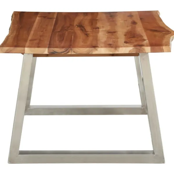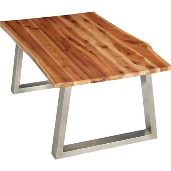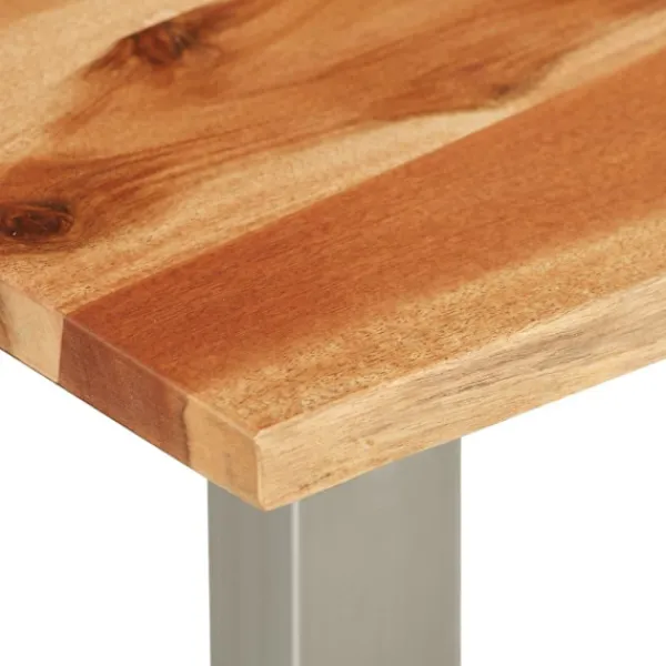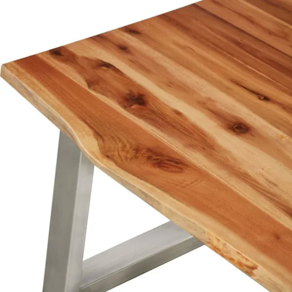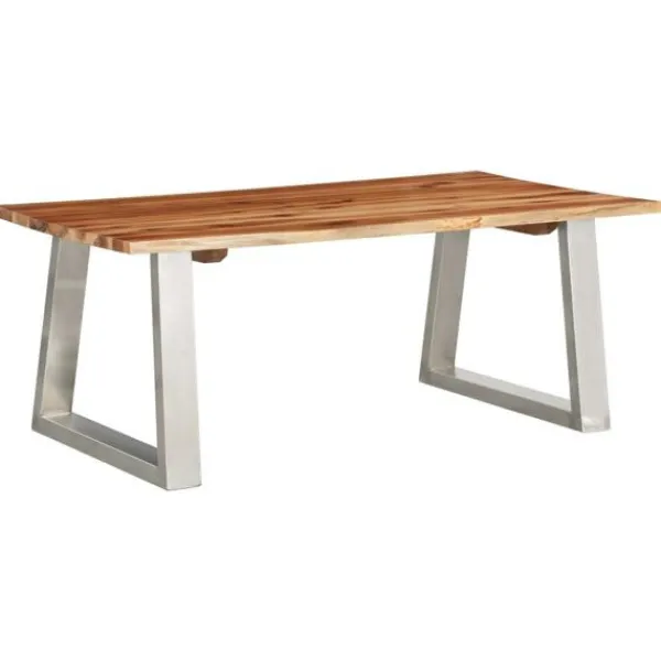 Detta premium soffbord har en cool industriell stil och blir ett utmärkt tillskott i ditt hem eller kontor. Bordsskivan är tillverkad i massivt akaciaträ och är ytterst stadig. Benen i rostfritt stål bidrar till bordets industriella stil och gör det stabilt. Träets levande kant som följer trädets naturliga kant gör bordet ännu vackrare. Soffbordet måste monteras. Observera att trä är en naturprodukt som kan uppvisa vissa defekter.
