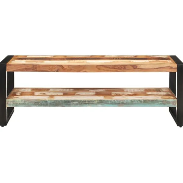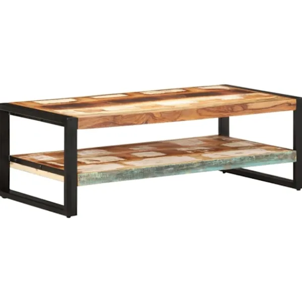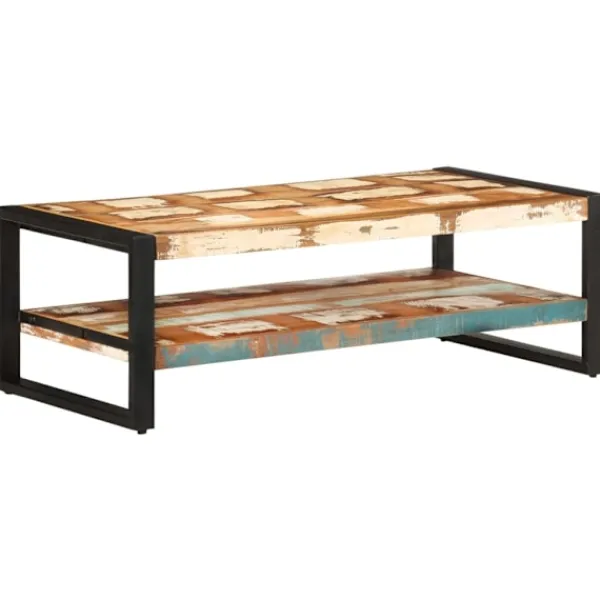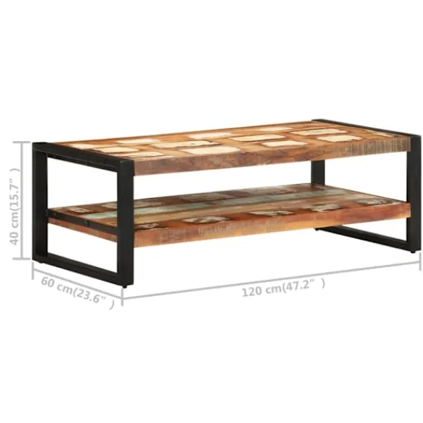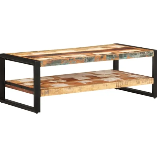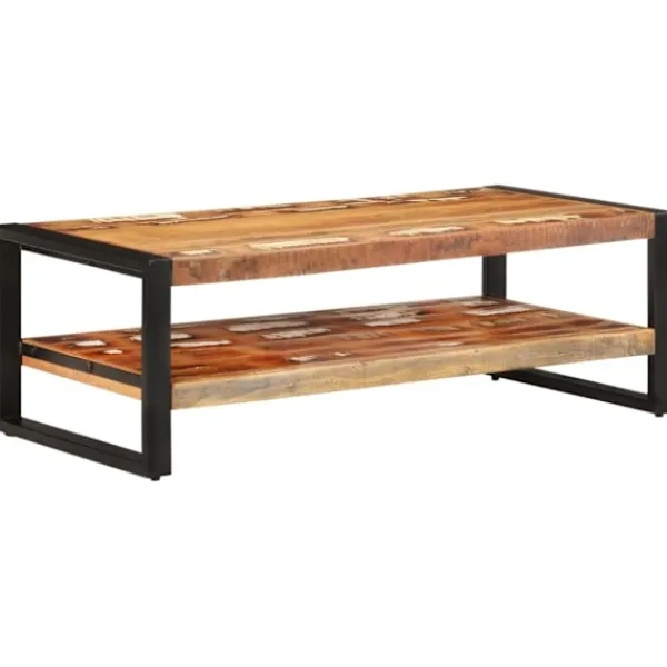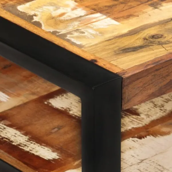 Med sin rustika charm kommer detta soffbord i trä att vara ett perfekt val för dig. Detta soffbord är tillverkat av massivt återvunnet trä som kommer från balkar, golv och stödbjälkar från gamla och rivna byggnader, vilket gör det till ett miljövänligt alternativ för möbeltillverkning. Det är en blandning av återvunnet virke, inklusive furu, teak, bok, mangoträd osv., vilket innebär att detta återvunna trä behåller egenskaperna hos respektive träslag. Den pulverlackerade stålramen bidrar till extra stabilitet. Detta praktiska accentbord har två plan, med gott om plats för att placera multimedieapparater, böcker, tidskrifter eller små föremål som du vill ha inom räckhåll. Du kan också placera drycker, vaser, fruktskålar och prydnadssaker på det. Viktigt: Färger varierar från möbel till möbel, vilket gör varje möbel unik. Leveransen är slumpartad, vilket säkerställer varje produkts exklusivitet och individualitet.