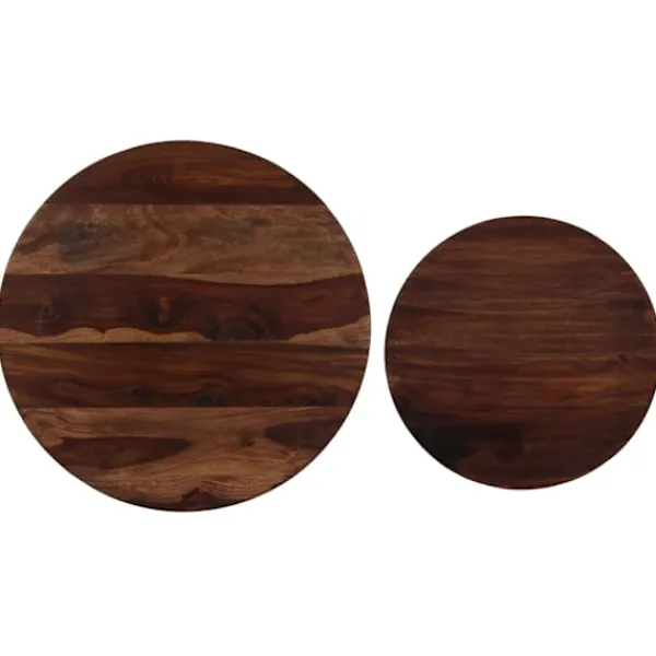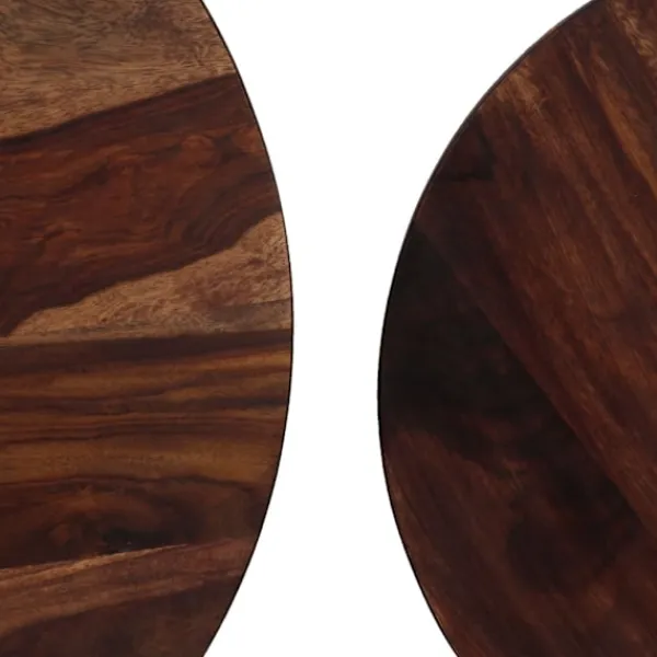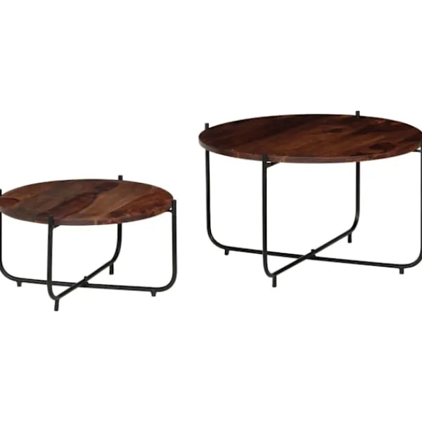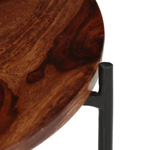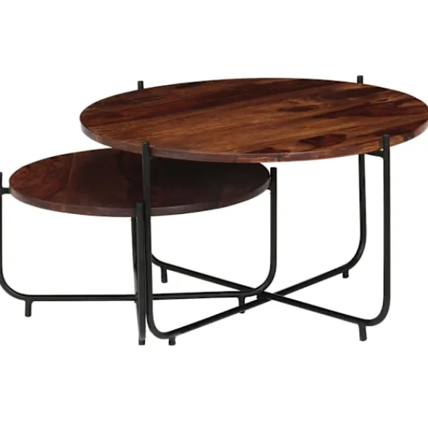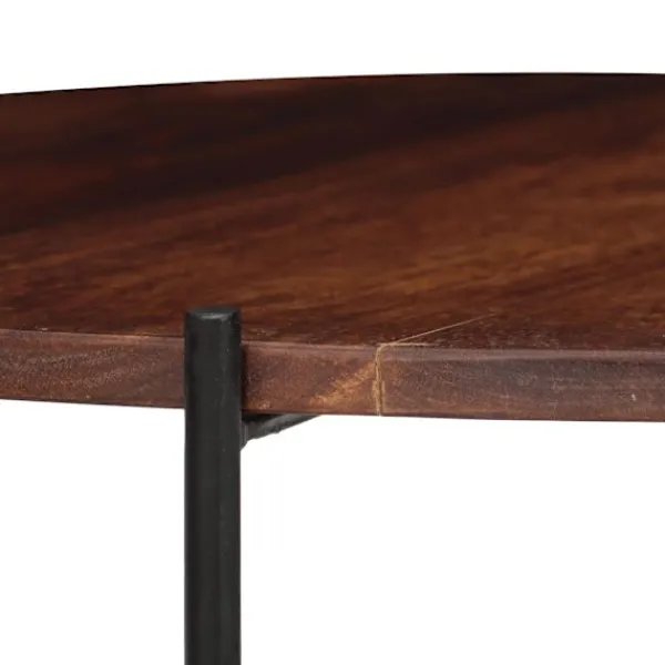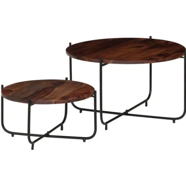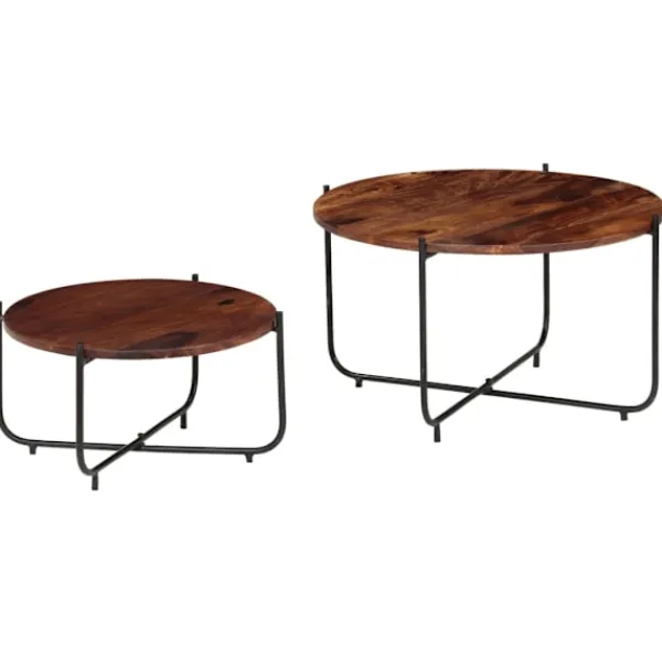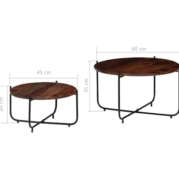 Uppsättningen består av 2 soffbord i trä som är tillverkade i massivt sheshamträ och kommer att ge din heminredning en känsla av vintage charm. De kan även användas som sidobord, avlastningsbord och vardagsrumsbord. Bordsskivan i massivt sheshamträ ger dig en stabil yta att ställa dryck, en fruktkorg, vas eller andra dekorativa föremål på. Shesham är ett tropiskt lövträ som är känt för sina rika ådringar och kallas även rosenträ eller palisander. De starka stålbenen bidrar till den robusta konstruktionen såväl som ett industriellt utseende. Hantverksskickligheten och de vackra träådringarna gör varje möbel unik och något annorlunda från nästa. Det mindre bordet kan placeras under det större för att spara plats. Vid leverans ingår 2 soffbord. Viktigt: Träfibrerna och färgerna kan variera från möbel till möbel, vilket gör varje soffbord unikt. Leveransen är slumpartad, vilket säkerställer varje produkts exklusivitet och individualitet.