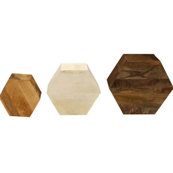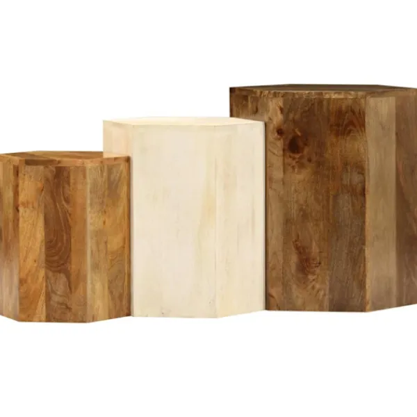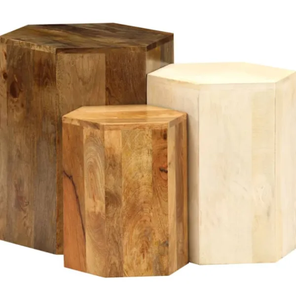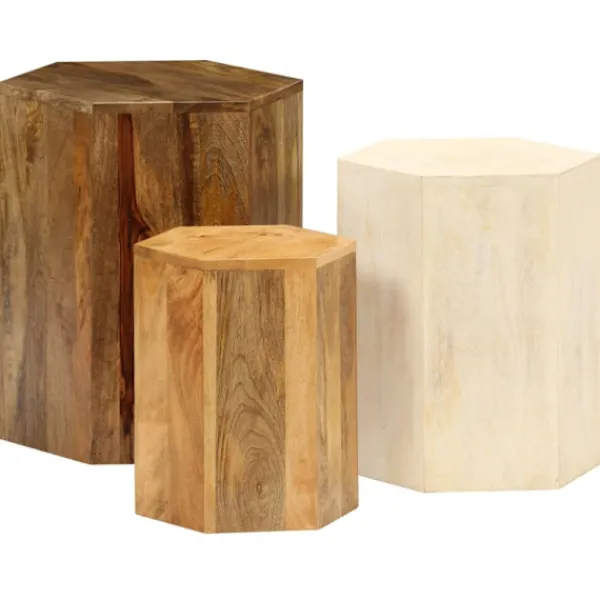 Dessa sidobord är handgjorda i massivt mangoträ som är stabilt, hållbart och vackert, och hantverket bidrar till deras spektakulära retro stil. Varje steg i processen utförs med största omsorg, om det så är polering, målning eller lackering. Hantverksskickligheten och de vackra träådringarna gör varje möbel unik och något annorlunda än nästa. Möblerna är redan monterade; ingen montering krävs. Vid leverans ingår 3 soffbord i olika storlekar.