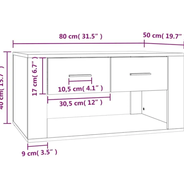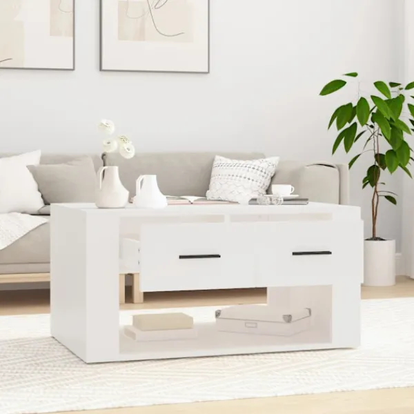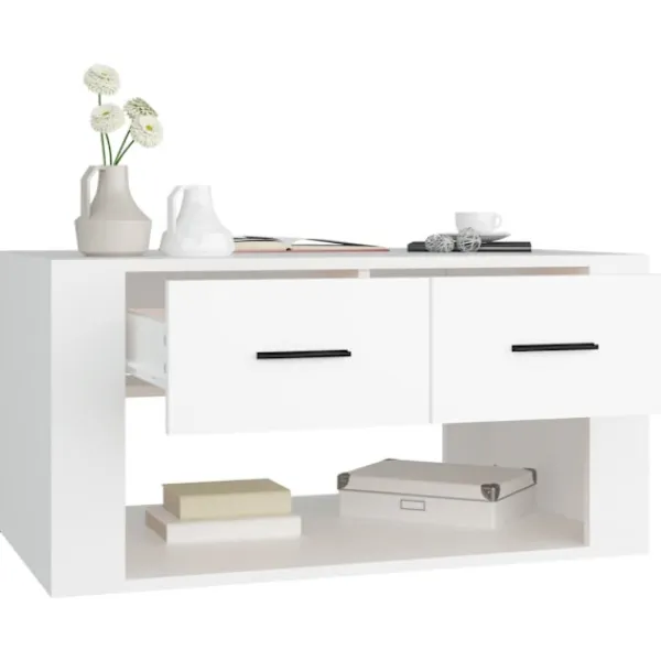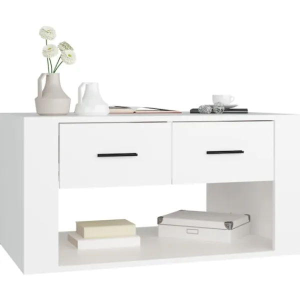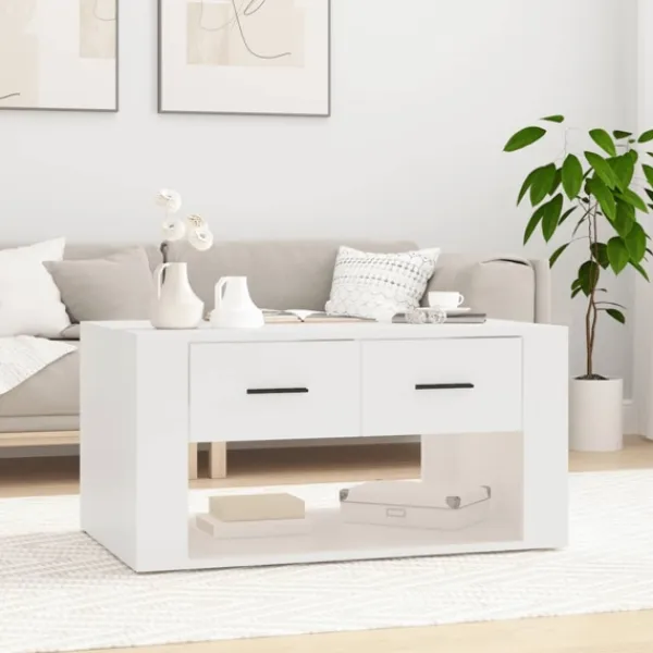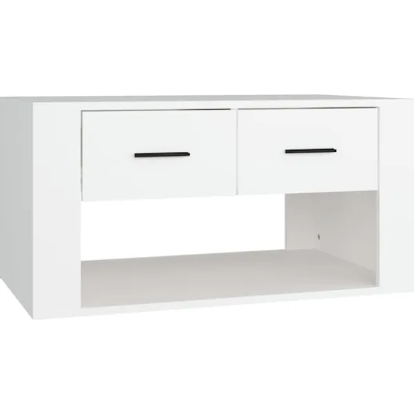 Letar du efter ett soffbord för din fritid? Detta soffbord utstrålar en unik känsla i ditt vardagsrum. Hållbart material: Det konstruerade träet är av exceptionell kvalitet med slät yta och är också starkt, stabilt och fuktbeständigt. Det är tillverkat av konstruerat trä och är enkelt att rengöra.Gott om förvaringsutrymme: Detta soffbord har 2 lådor, vilket möjliggör riklig och organiserad förvaring för dina vardagliga nödvändigheter.Praktisk bordsskiva: Vardagsrumsbordet har en tålig yta för att placera snacks, drycker, vaser, fruktskålar eller prydnadssaker på. Observera:Varje produkt levereras med en monteringsmanual i lådan för enkel montering.