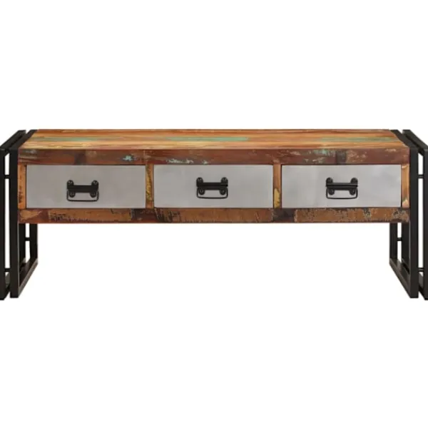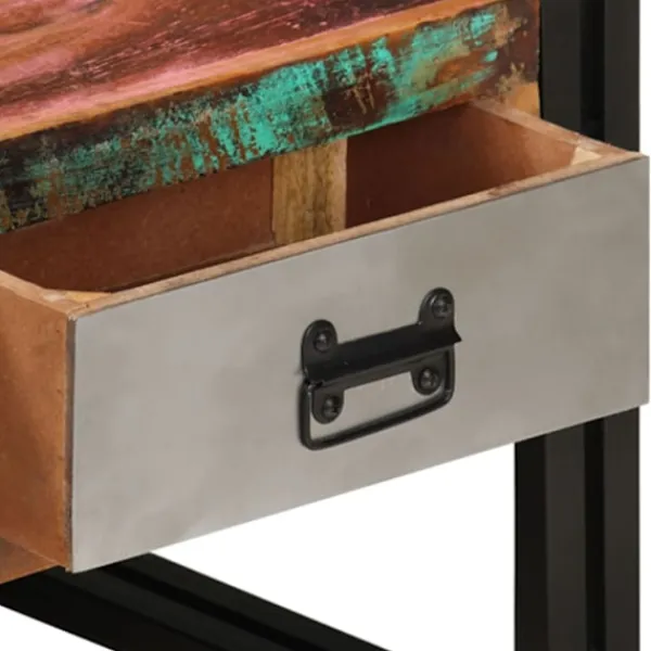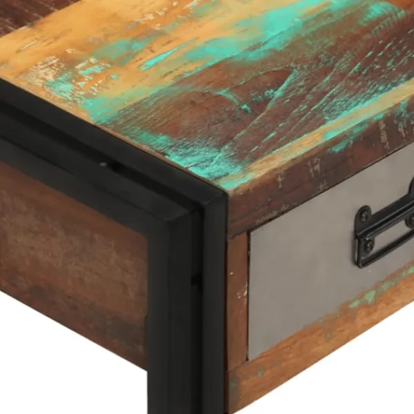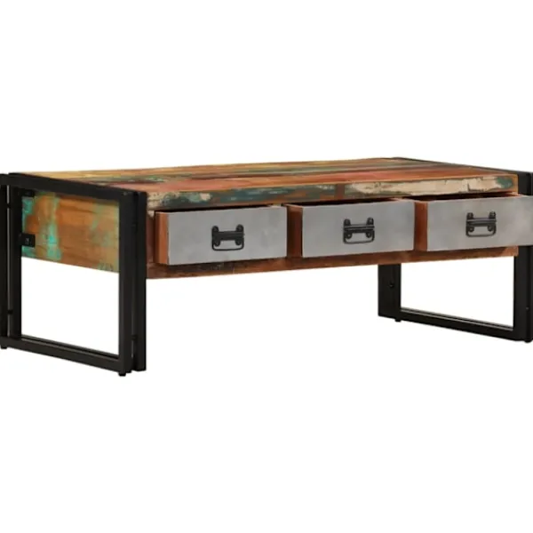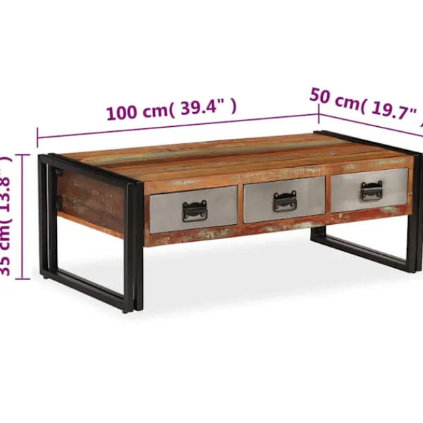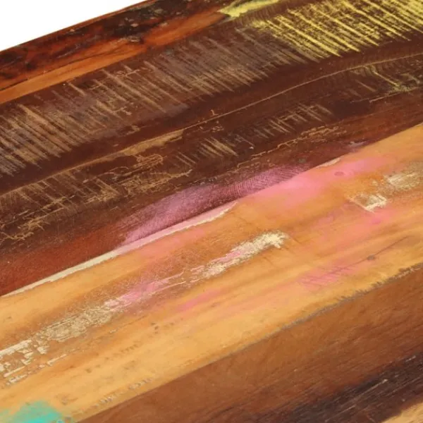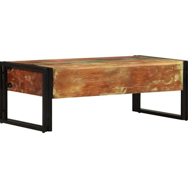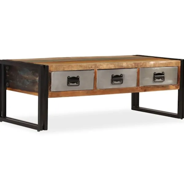 Detta soffbord i massivt trä med en spektakulär vintagestil blir ett dekorativt och praktiskt tillägg i din inredning. Bordet är tillverkat i massivt återvunnet trä som har samlats in från reglar, golv och balkar från gamla byggnader som har rivits, och kan bestå av olika typer av trä såsom furu, teak, björk, ek, ceder, mangoträ, akacia, osv. Detta innebär att det återvunna träet behåller egenskaperna från dessa olika träslag. Återvunnet trä är redan åldrat, vittrat och torkat, så det varken krymper eller böjs, det behöver heller inte ytbehandlas. De vackra träådringarna gör varje möbel unik och något annorlunda från de andra. Tecken på slitage och synliga träådringar vittnar om träets rika historia och ger bordet ett varmt och autentiskt utseende. Varje steg i processen utförs med största omsorg, vare sig det är polering, målning eller lackering. Dess stadiga bordsskiva är ideal för att ställa drinkar, lampor med mera.