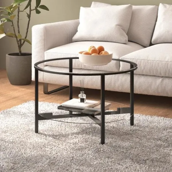 Detta trendiga soffbord ger en unik touch av modern stil till din befintliga heminredning. Den kan användas som soffbord, sidobord eller hörnbord. Modern stil: Lägg till något modernt till din befintliga inredning! Den moderna inredningsstilen har skarpa linjer, minimalistiska möbler och ett naturligt ljus som nyckelord.Stabil ram: Bordet är tillverkat av härdat glas och pulverlackerat järn, vilket gör det mycket stadigt och stabilt.Förvaringsfunktion: De två bordsskivorna på detta runda soffbord är perfekt för att placera drycker, vaser, tidskrifter, böcker, fjärrkontroller och andra väsentligheter på.