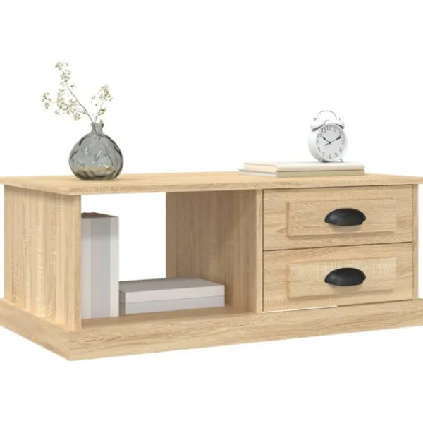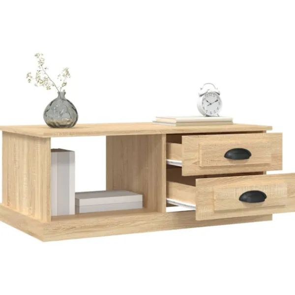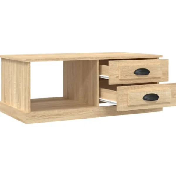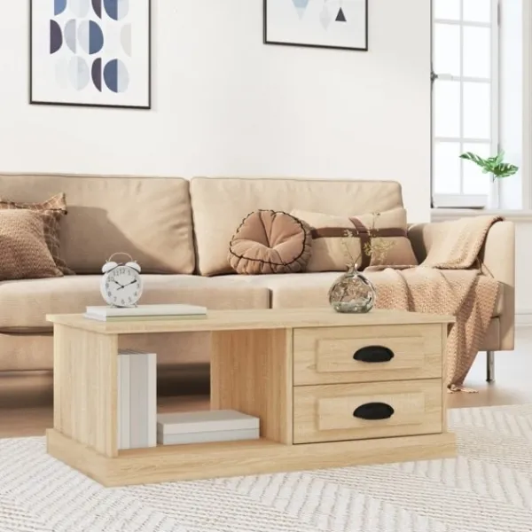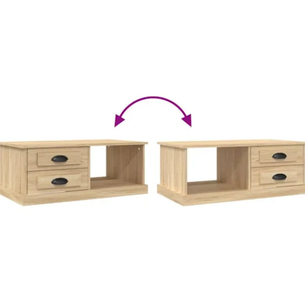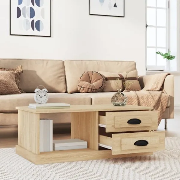 Letar du efter ett soffbord för din fritid? Detta soffbord utstrålar en unik känsla i ditt vardagsrum. Hållbart material: Det konstruerade träet är av exceptionell kvalitet med slät yta och är också starkt, stabilt och fuktbeständigt. Det är tillverkat av konstruerat trä och är enkelt att rengöra.Gott om förvaringsutrymme: Detta soffbord har 2 byrålådor och 1 öppet utrymme, vilket ger gott om förvaringsutrymme för att hålla dina tillhörigheter organiserade och i närheten av soffan.Robust bordsskiva: Den robusta bordsskivan är perfekt för att placera dina drycker, mat och andra dekorativa föremål.Flexibel montering: Byrålådorna kan monteras på vänster eller höger sida. Bra att känna till:För att göra monteringen så enkel som möjligt, levereras varje produkt med en bruksanvisning.