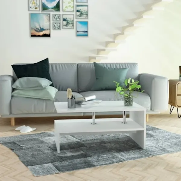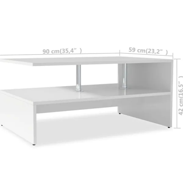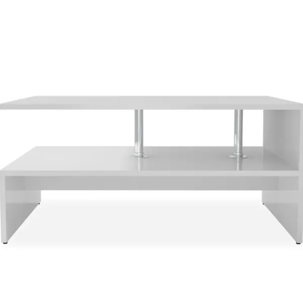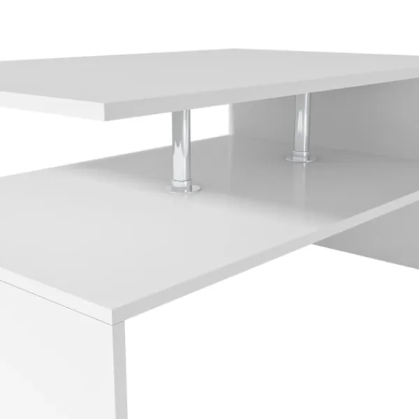 Detta moderna soffbord har en unik design som passar alla inredningar. Soffbordet är tillverkat i spånskiva med PVC-kanter och är stabilt och hållbart. Sidobordet har två hyllor som förenas på en sida och stöds av stolparna i rostfritt stål som utstrålar en modern känsla. Mellan de övre och lägre hyllorna finns ett större utrymme som gör detta bord väldigt praktiskt för att förvara böcker, dokument och andra föremål. Monteringen är enkel, allt du behöver ingår.