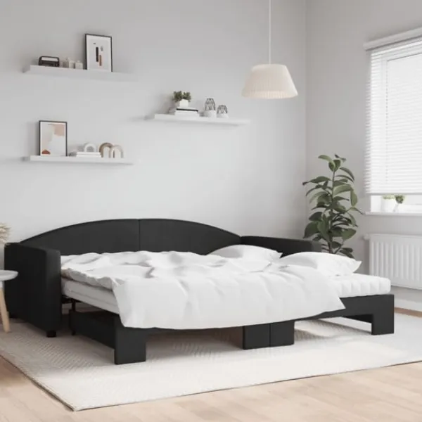 Denna 2-i-1-dagbädd med extrabädd, som kan användas som både soffa och säng, blir ett praktiskt och iögonfallande tillskott till ditt vardagsrum eller sovrum. Mångsidig dagbädd: Bäddsoffan fungerar som en soffa under dagen och kan enkelt omvandlas till en dubbelsäng på natten genom att dra ut extrasängen, vilket är en bekväm lösning för övernattande gäster och för att maximera ytan.Bekväm skummadrass: Denna dagbädd levereras med två skummadrasser för maximalt stöd och optimal komfort.Slitstarkt tyg och solid konstruktion: Denna dagbädd har en robust ram av trä och metall och är klädd i slitstarkt och mjukt tyg.Modern design: Bäddsoffan har en modern design med rena linjer och ett minimalistiskt och lätt utseende, vilket kommer att tillföra en modern stil till din interiör!
