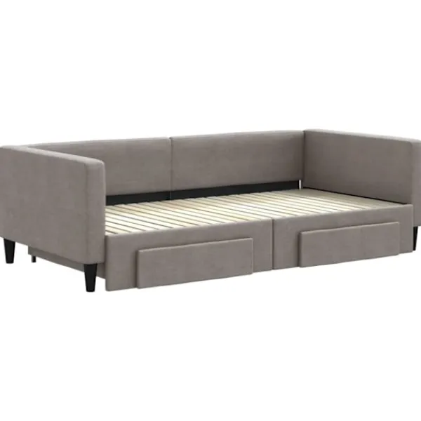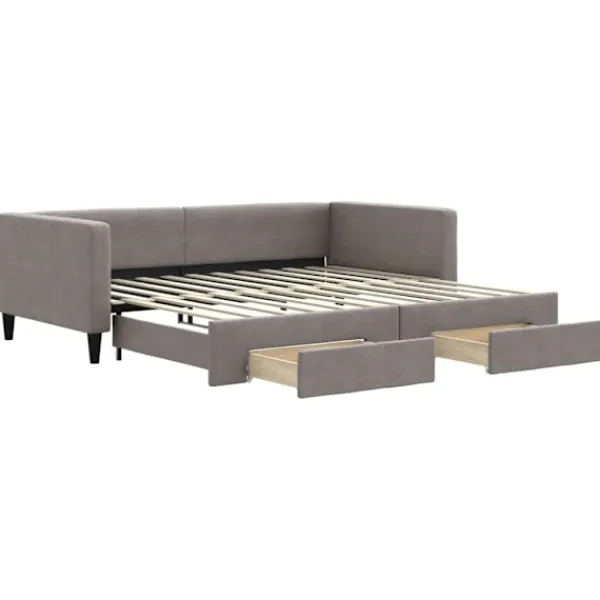Denna 2-i-1-dagbädd med extrabädd, som kan användas som både soffa och säng, blir ett praktiskt och iögonfallande tillskott till ditt vardagsrum eller sovrum. Mångsidig dagbädd: Bäddsoffan fungerar som en soffa under dagen och kan enkelt omvandlas till en dubbelsäng på natten genom att dra ut extrasängen, vilket är en bekväm lösning för övernattande gäster och för att maximera ytan. Gott om förvaringsutrymme: Denna gästsäng har två lådor med hjul med gott om utrymme för förvaring av dina kläder, strumpor, leksaker, kuddar etc. Slitstarkt tyg och solid konstruktion: Denna dagbädd har en robust ram av trä och metall och är klädd i slitstarkt och mjukt tyg. Bra att känna till:Madrasser medföljer inte denna dagbädd. Vi säljer ett urval av madrasser. Du kan titta i vår shop för matchande madrasser.