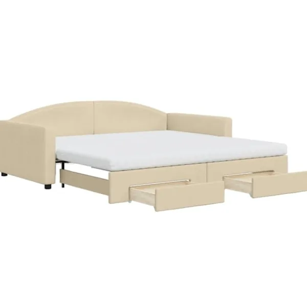 Denna 2-i-1-dagbädd med extrabädd, som kan användas som både soffa och säng, blir ett praktiskt och iögonfallande tillskott till ditt vardagsrum eller sovrum. Mångsidig dagbädd: Bäddsoffan fungerar som en soffa under dagen och kan enkelt omvandlas till en dubbelsäng på natten genom att dra ut extrasängen, vilket är en bekväm lösning för övernattande gäster och för att maximera ytan.Gott om förvaringsutrymme: Denna gästsäng har två lådor med hjul med gott om utrymme för förvaring av dina kläder, strumpor, leksaker, kuddar etc.Bekväm skummadrass: Denna dagbädd levereras med två skummadrasser för maximalt stöd och optimal komfort.Slitstarkt tyg och solid konstruktion: Denna dagbädd har en robust ram av trä och metall och är klädd i slitstarkt och mjukt tyg.