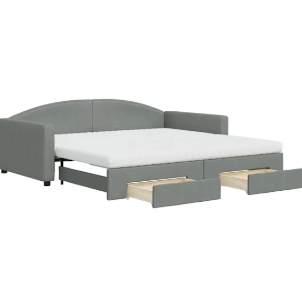 Denna 2-i-1-dagbädd med extrabädd, som kan användas som både soffa och säng, blir ett praktiskt och iögonfallande tillskott till ditt vardagsrum eller sovrum. Mångsidig dagbädd: Bäddsoffan fungerar som en soffa under dagen och kan enkelt omvandlas till en dubbelsäng på natten genom att dra ut extrasängen, vilket är en bekväm lösning för övernattande gäster och för att maximera ytan.Gott om förvaringsutrymme: Denna gästsäng har två lådor med hjul med gott om utrymme för förvaring av dina kläder, strumpor, leksaker, kuddar etc.Bekväm skummadrass: Denna dagbädd levereras med två skummadrasser för maximalt stöd och optimal komfort.Slitstarkt tyg och solid konstruktion: Denna dagbädd har en robust ram av trä och metall och är klädd i slitstarkt och mjukt tyg.