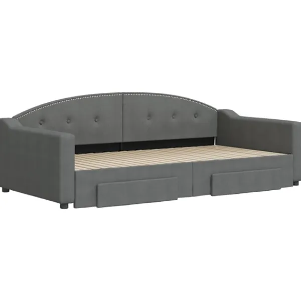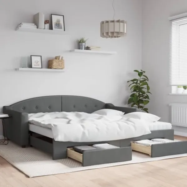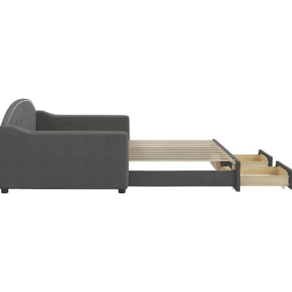 Denna 2-i-1-dagbädd med extrabädd, som kan användas som både soffa och säng, blir ett praktiskt och iögonfallande tillskott till ditt vardagsrum eller sovrum. Mångsidig dagbädd: Bäddsoffan fungerar som en soffa under dagen och kan enkelt omvandlas till en dubbelsäng på natten genom att dra ut extrasängen, vilket är en bekväm lösning för övernattande gäster och för att maximera ytan. Gott om förvaringsutrymme: Denna gästsäng har två lådor med hjul med gott om utrymme för förvaring av dina kläder, strumpor, leksaker, kuddar etc. Slitstarkt tyg och solid konstruktion: Denna dagbädd har en robust ram av trä och metall och är klädd i slitstarkt och mjukt tyg. Bra att känna till:Madrasser medföljer inte denna dagbädd. Vi säljer ett urval av madrasser. Du kan titta i vår shop för matchande madrasser.