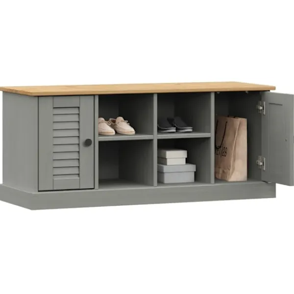 Denna klassiska skobänk i trä är exceptionellt vacker och gör ditt rum bättre organiserat. Massiv furu: Massivt furuträ är ett vackert naturmaterial. Furuträ har raka fibrer, och kvistarna ger materialet en rustik utstrålning. Då det är tillverkad i massiv furu är skoskåpet slitstarkt och robust.Gott om förvaringsutrymme: Denna bänk är designad med 4 fack och 2 små skåp med dörr för att förvara och hålla dina skor och småsaker välorganiserade.Lätt att underhålla: Hallbänken är lätt att rengöra med en fuktig trasa och kräver minimalt underhåll.Metallknoppar: Hallbänken levereras med metallknoppar som gör det enkelt att öppna och stänga dörrarna, samtidigt som det förhöjer dess skönhet.