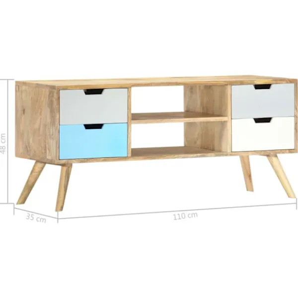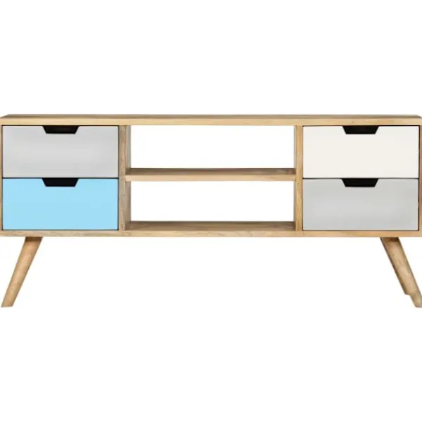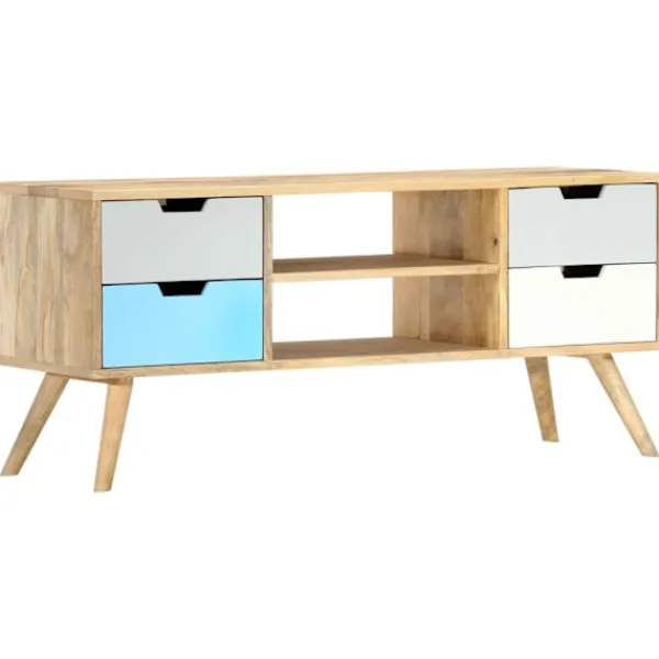 Denna TV-bänk i massivt trä med lackering blir ett såväl dekorativt som praktiskt tillägg i din inredning. Den kan också användas som en skänk eller en HiFi-bänk. Skåpet är handgjort i mangoträ som är massivt, stabilt, hållbart och vackert, och hantverksskickligheten bidrar till dess spektakulära retro stil. Varje steg i processen utförs med största omsorg, vare sig det är polering eller lackering. Hantverksskickligheten och de vackra träådringarna gör varje möbel unik och något annorlunda från de andra. Denna skänk har en stadig ovansida där du kan ställa dekorativa föremål såsom fruktkorgar eller vaser. Det har fyra lådor, 2 fack, och erbjuder gott om utrymme för att hålla dina viktiga saker organiserade och inom räckhåll. Vårt TV-skåp är enkelt att montera. OBS: Färger och ådringar varierar från möbel till möbel, vilket gör varje TV-bänk unik. Leveransen är slumpartad.