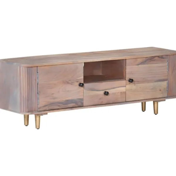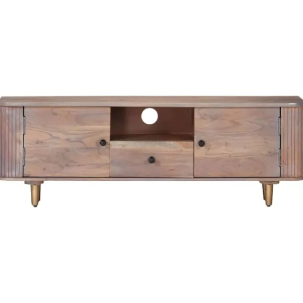 Denna tv-bänk i trä utstrålar en industriell look och passar i vardagsrummet och sovrummet. TV-bänken är tillverkad i massivt akaciaträ, ett lövträ med täta fibrer, vilket gör den stabil och hållbar. Järnbenen bidrar till extra stabilitet och den robusta toppen kan användas för att ställa dina dekorativa föremål. Förvaringsfacket och lådorna har också gott om utrymme för förvaring av dina multimediaapparater, böcker och olika andra föremål. OBS: Färger och ådringar varierar från möbel till möbel, vilket gör varje produkt unik. Leveransen är slumpartad.