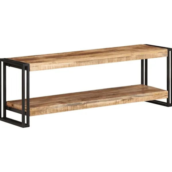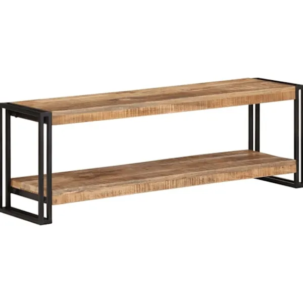 Denna tv-bänk i trä utstrålar en industriell look och passar i vardagsrummet och sovrummet. TV-bänken är tillverkad i grovt mangoträ, ett tropiskt träslag som är starkt nog att bära tung vikt. Det är även slitstarkt, vilket gör den stabil och hållbar. Den stadiga bordsskivan kan användas för att visa upp prydnadssaker. Förvaringshyllan har även gott om plats för mediaenheter, böcker och andra saker. OBS: Färger och ådringar varierar från möbel till möbel, vilket gör varje produkt unik. Leveransen är slumpartad.