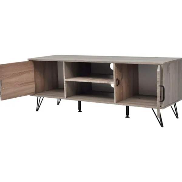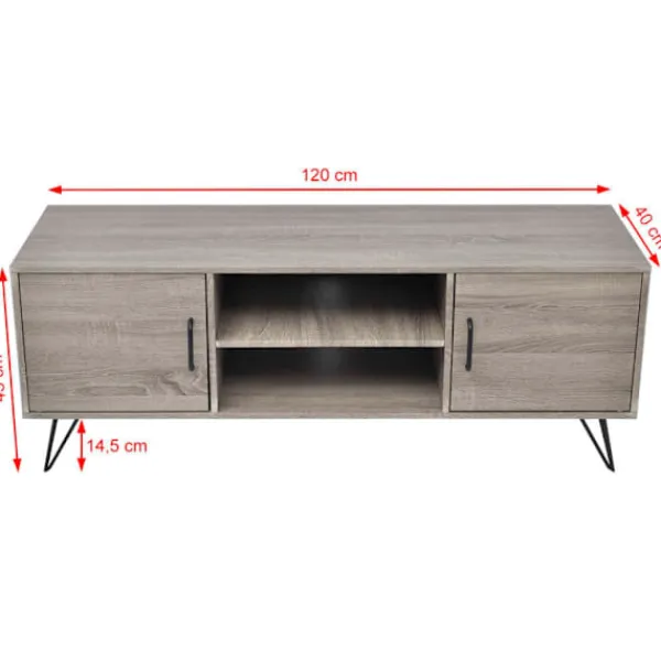 Denna moderna TV-bänk kommer att utgöra ett blickfång i ditt vardagsrum eller underhållningsområde. Den erbjuder rikligt med förvaringsutrymme och den är väldigt praktisk tack vare sin rymliga design. Den grå färgen ger skåpet ett rustikt utseende och känsla som passar in i alla typer av inredningar. Tack vare dess högkvalitativa MDF och de starka stålbenen är denna TV-bänk väldigt stadig och hållbar. De stora facken och hyllorna erbjuder rikligt med utrymme att förvara din DVD-spelare, spelkonsol, strömningsenhet eller andra mediaenheter väl organiserade i. Dessutom finns det två hål att trä sladdar igenom så att du på ett prydligt sätt kan förvara dem utom räckhåll. Med denna funktionella mediakonsol kan du skapa ett elegant och modernt mediacenter. Monteringen är väldigt enkel.