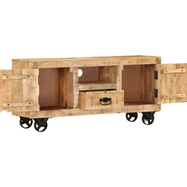 TV-bänken är tillverkad för hand i ett massivt och grovt mangoträ vilket är stadigt, slitstarkt och vackert, och hantverket förhöjer dess spektakulära retrostil. Varje del i processen utförs med yttersta omsorg, vare sig det gäller polering eller lackering. Hantverket och de vackra träfibrerna gör varje möbel unik och att de skiljer sig något från varandra. Dessutom tillhandahåller de 2 skåpen, 1 låda och 1 hylla rikligt med utrymme att förvara multimediaenheter, mediaspelare och andra föremål som du vill visa upp eller ha inom räckhåll. Skåpet är utrustat med 4 järnhjul vilket gör det enkelt att flytta runt och kompletterar dess industriella utseende.