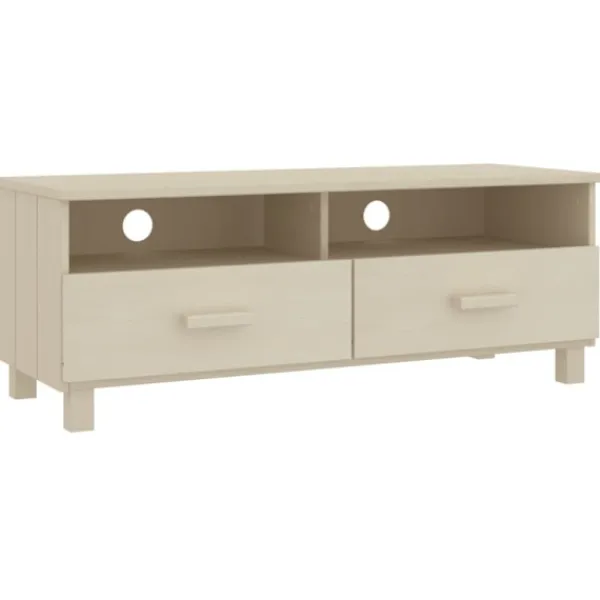 Tv-bänken är tillverkad i massivt furuträ, vilket gör den stabil och robust. Tv-enheten har 2 lådor och 2 fack, med gott om lagringsutrymme för att hålla dina multimediaapparater, böcker och andra föremål välorganiserade och inom räckhåll. Dessutom är den robusta bordsskivan perfekt för att visa upp dekorativa föremål, fotoramar och krukväxter. Tack vare spåret på baksidan kan du dölja kablarna bakom skåpet för att hålla dem utom synhåll.
