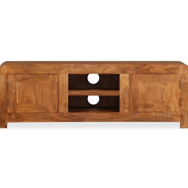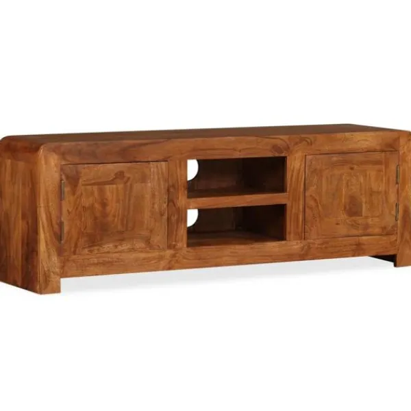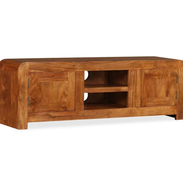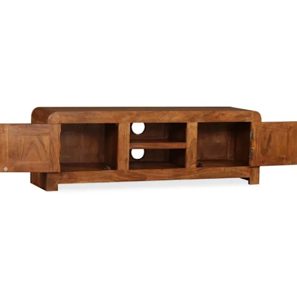 Denna eleganta och praktiska TV-bänk i trä blir ett tidlöst tillägg i ditt hem. Den kan även användas som underskåp, sidobord eller skänk. Tv-bänken är tillverkad i massivt akaciaträ med honungsfinish. Acacia är ett hållbart tropiskt lövträ. Tv-bänken är helt handgjord och de vackra träådringarna gör varje möbel unik. Dess 2 skåp och 2 hyllor har gott om utrymme för lagring av multimediaenheter, mediekonsoler och andra föremål som du vill visa eller hålla inom räckhåll. Varje skåp har en dörr med ett speciellt gångjärn, på detta sätt behöver dörren inte ett dörrhandtag. Denna vara är redan monterad, ingen montering krävs. Viktigt: Färger varierar från möbel till möbel, vilket gör varje möbel unik. Leveransen är slumpartad, vilket säkerställer varje produkts exklusivitet och individualitet.