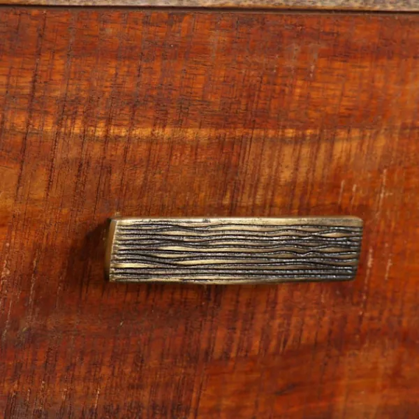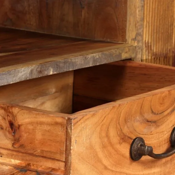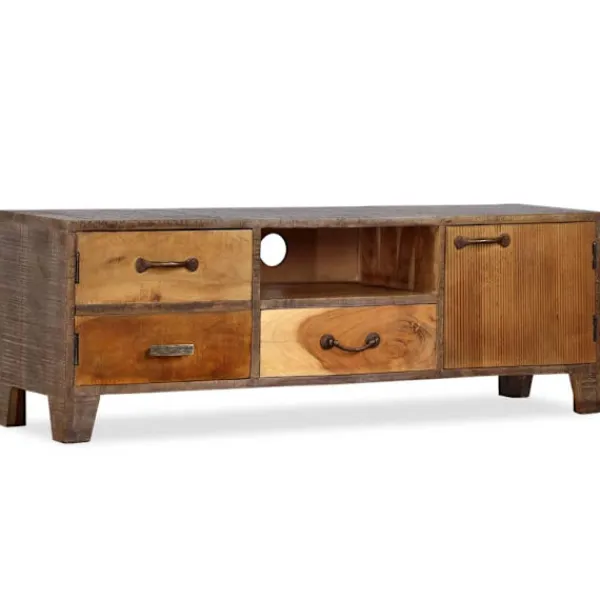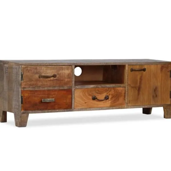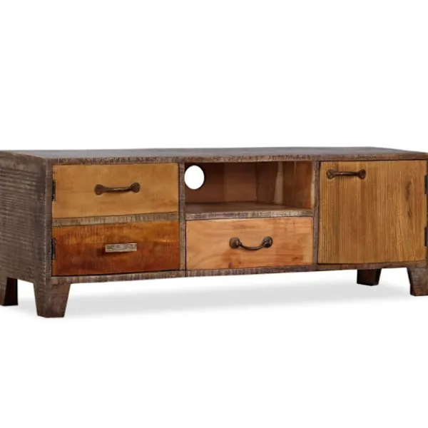 Denna TV-bänk i trä med antik stil utstrålar en vintage charm och blir ett fint tillägg i din inredning. HiFi-bänken är tillverkad i massivt trä som har belagts med en vacker ytbehandling genom polering, målning och lackering för ett elegant utseende. De kontrasterande färgerna ger TV-bänken ett unikt utseende. Bänken är helt handgjord och de vackra träådringarna gör varje möbel unik och något annorlunda från nästa. Denna TV-möbel har en stadig och stabil yta där du kan ställa din TV, en fruktkorg, en vas eller andra dekorativa föremål. Skänken har 1 dörr, 1 fack och 3 lådor med gott om utrymme för att förvara dina multimedia-apparater, böcker och andra föremål. Möbeln är redan monterad så ingen montering krävs. Viktigt: Färger varierar från möbel till möbel, vilket gör varje möbel unik. Leveransen är slumpartad, vilket säkerställer varje produkts exklusivitet och individualitet.