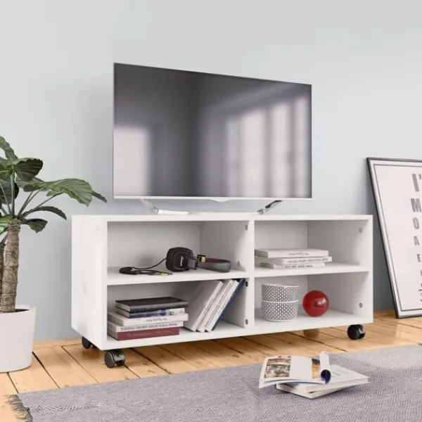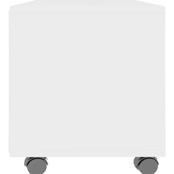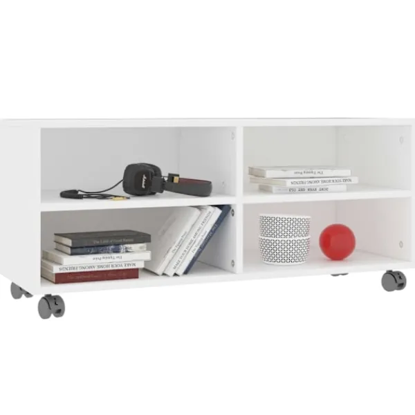 Tack vare sin trendiga och praktiska design blir denna TV-bänk ett riktigt blickfång i ditt rum. Tv-bänken är tillverkad av konstruerat trä, vilket säkerställer robusthet, hållbarhet och lång livslängd. Den är utformad med 4 fack och erbjuder gott om förvaringsutrymme för att hålla dina tidningar, böcker, DVD och mediaenheter välorganiserade och inom räckhåll. Dessutom kan du enkelt flytta den med dess 4 hjul, den har även 2 låsbara hjul. TV-bänken är enkel att rengöra med en fuktig duk och monteras med de medföljande monteringstillbehören.