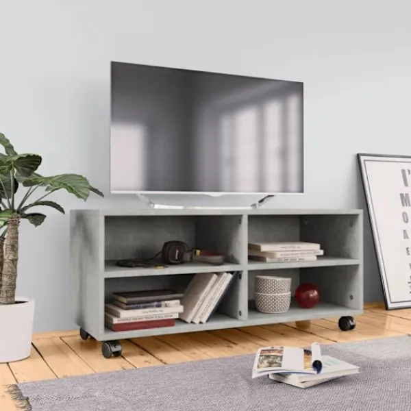 Tv-bänken är tillverkad av konstruerat trä, vilket säkerställer robusthet, hållbarhet och lång livslängd. Den är utformad med 4 fack och erbjuder gott om förvaringsutrymme för att hålla dina tidningar, böcker, DVD och mediaenheter välorganiserade och inom räckhåll. Dessutom kan du enkelt flytta den med dess 4 hjul, den har även 2 låsbara hjul.