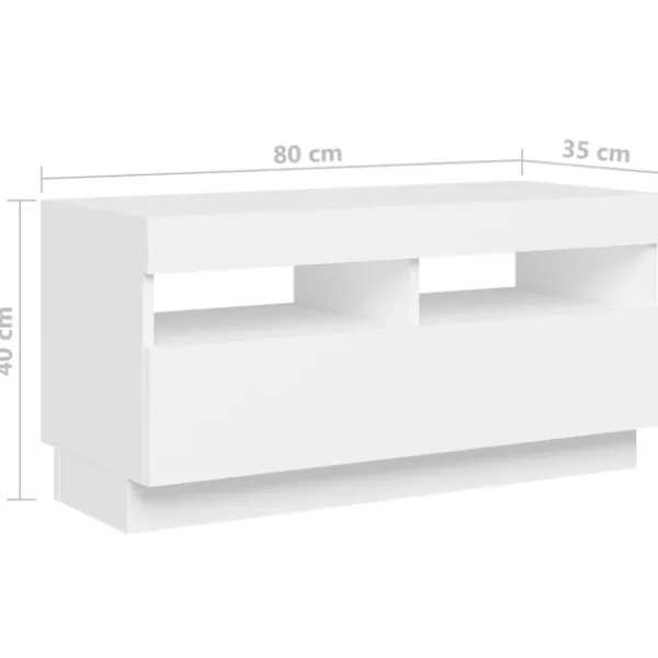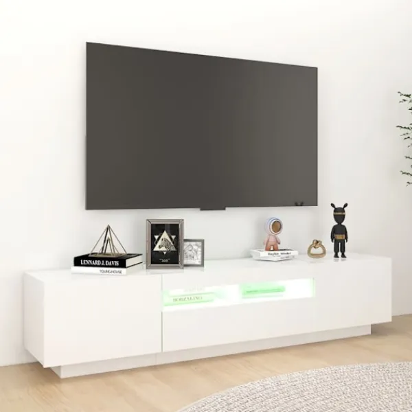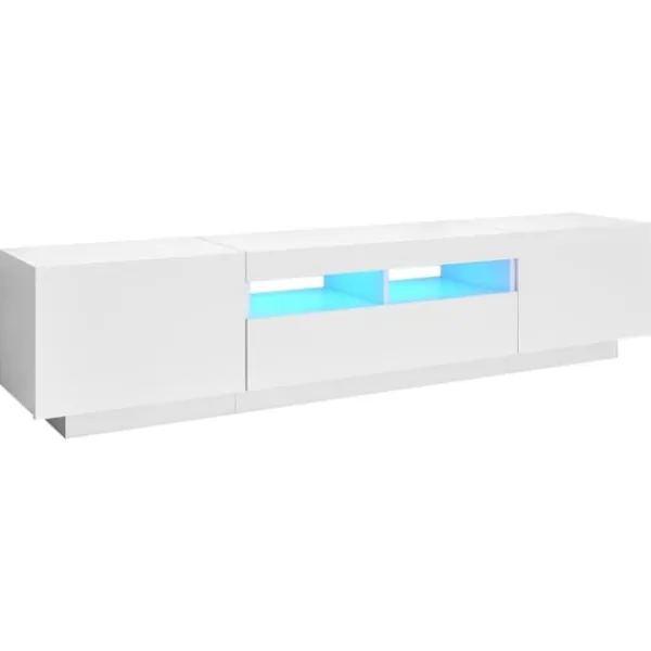 Tack vare sin trendiga och praktiska design blir denna TV-bänk med LED-belysning ett riktigt blickfång i ditt rum. Denna TV-bänk har en robust konstruktion som gör det mycket hållbart. Det finns gott om utrymme för att förvara din DVD-spelare, spelkonsol, strömenhet och mediebärare prydligt organiserade. Denna TV-bänk har RGB LED-lampor, med olika menyer för att ändra färg på lamporna och ställa in automatisk färgjustering. LED-lamporna understryker det moderna utseendet och bidrar till dess trendiga känsla. Dessutom är denna TV-enhet lätt att rengöra med en fuktig trasa. Obs: Denna tv-bänk består av 1 skåp med LED-lampor och 1 skåp som kan delas upp i 2 små skåp.Denna produkt har en USB-kontakt, men den certifierade 5V USB-strömkällan ingår inte.